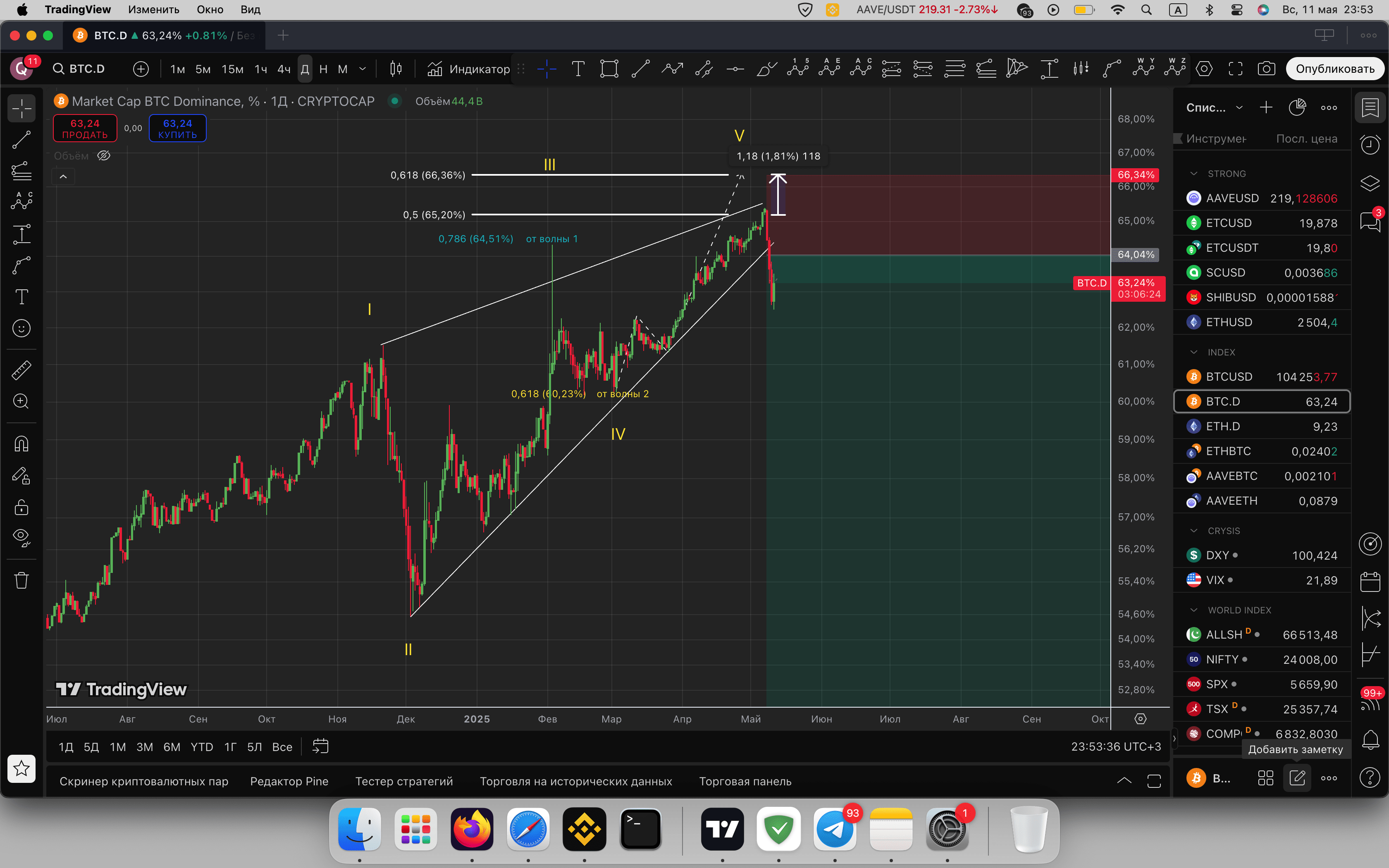Attualmente BTC.D ha raggiunto un livello chiave, corrispondente alla proiezione 0.618 di Fibonacci, e ha iniziato a diminuire. Questo indica una ristrutturazione del capitale verso gli altcoin e un possibile inizio della stagione degli altcoin.