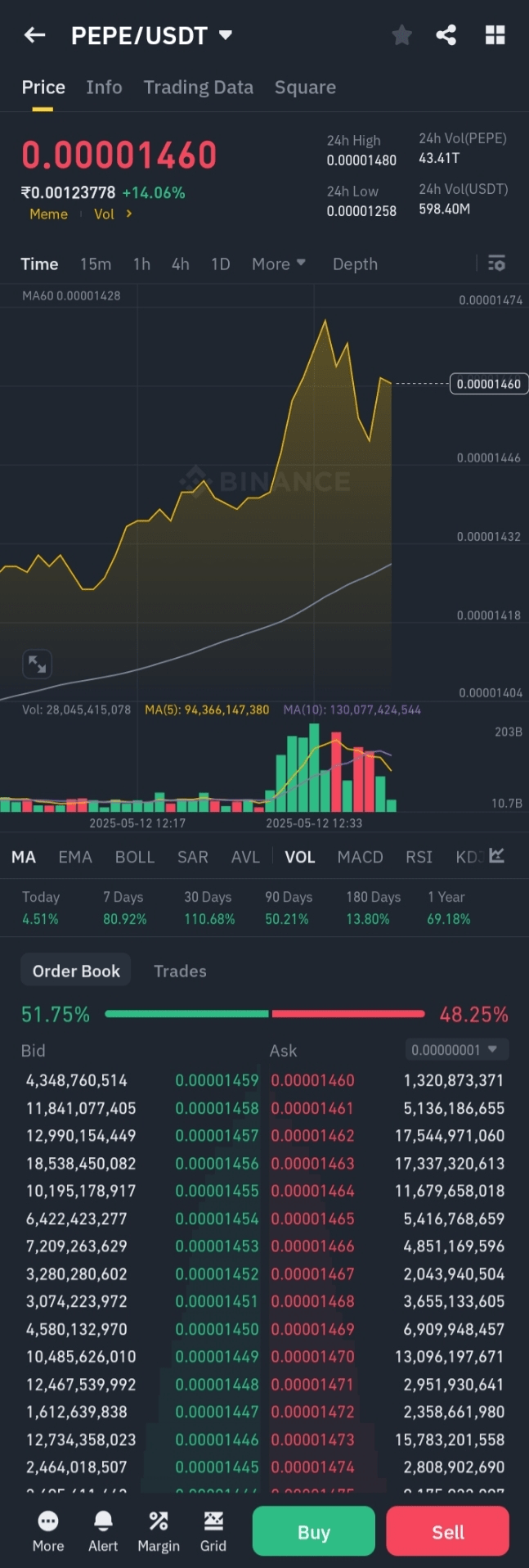 A partire dal 12 maggio 2025, Pepe Coin ($PEPE ) è scambiato a circa **\$0.000014**.