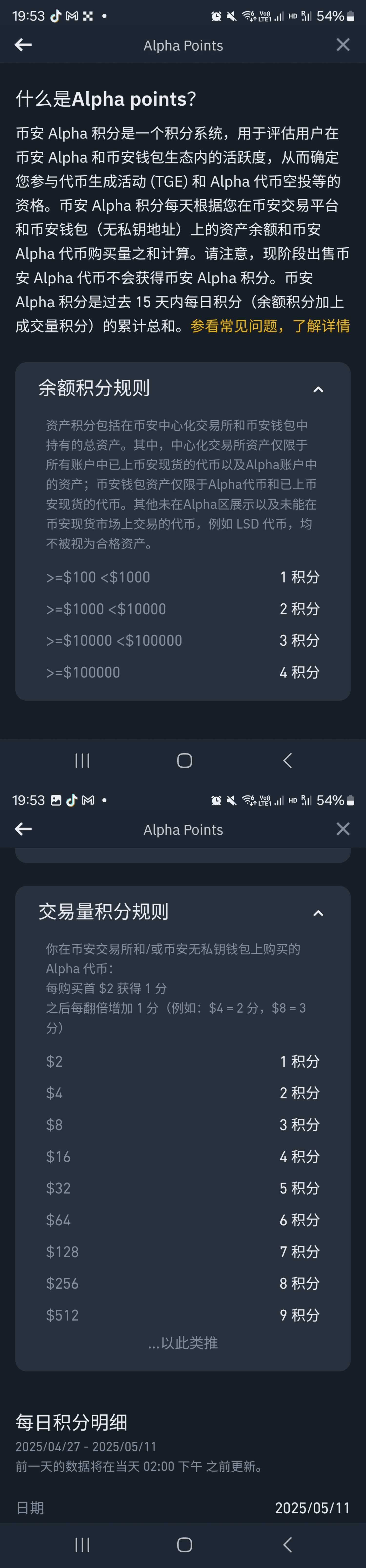 Ci sono due modi per guadagnare punti su Binance Alpha: depositare denaro su Binance Exchange o nel portafoglio Binance + scambiare ogni giorno i token già presenti su Binance Alpha; le regole per i punti sono riportate nella figura 4.