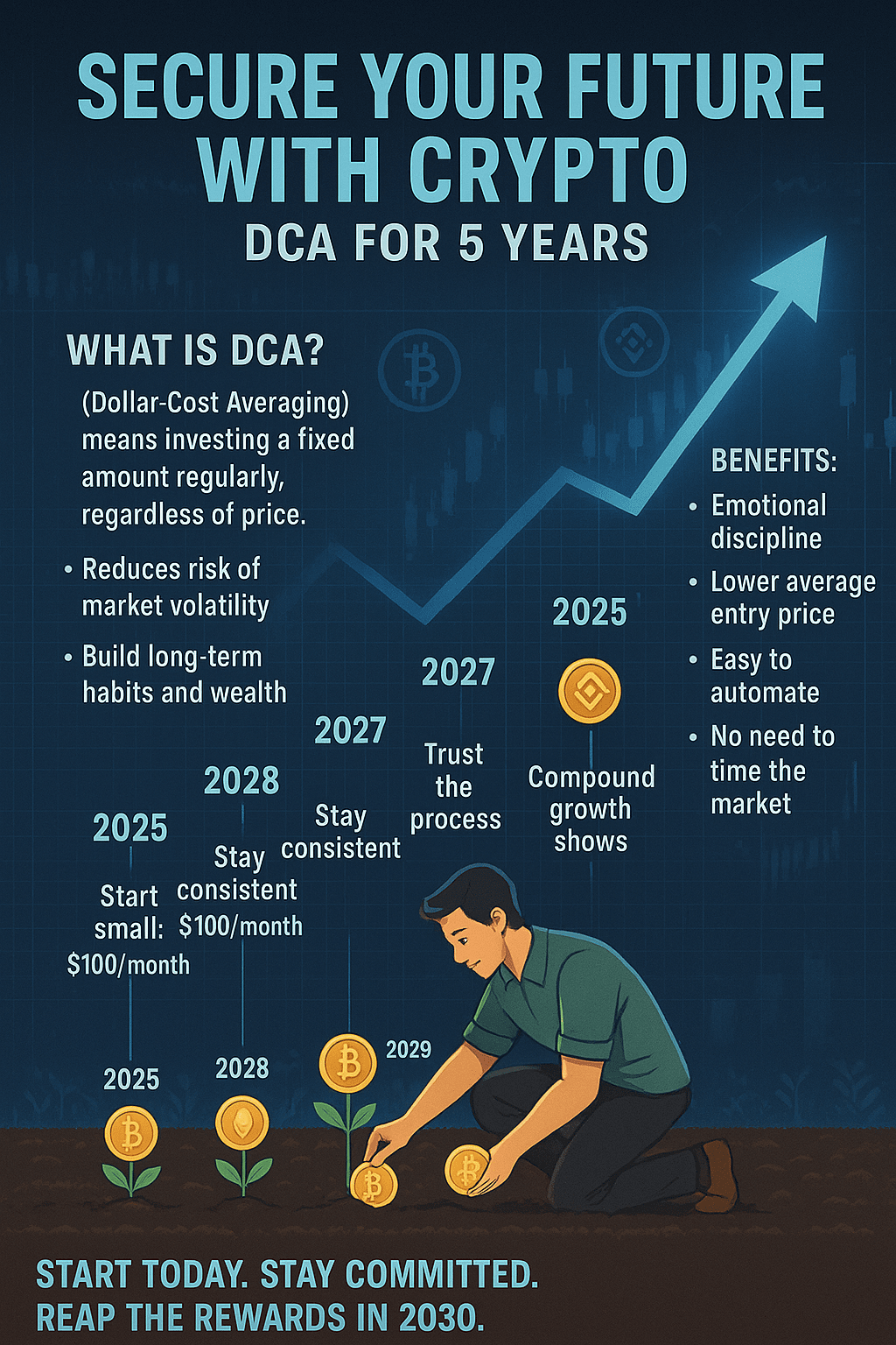 Di seguito ci sono **10 Crypto Coins** che consiglio di accumulare sistematicamente nei prossimi cinque anni utilizzando il metodo **DCA (Dollar-Cost Averaging)**. Tuttavia, il mercato delle Crypto è molto volatile e rischioso, quindi è importante per te **fare le tue ricerche (DYOR)**.