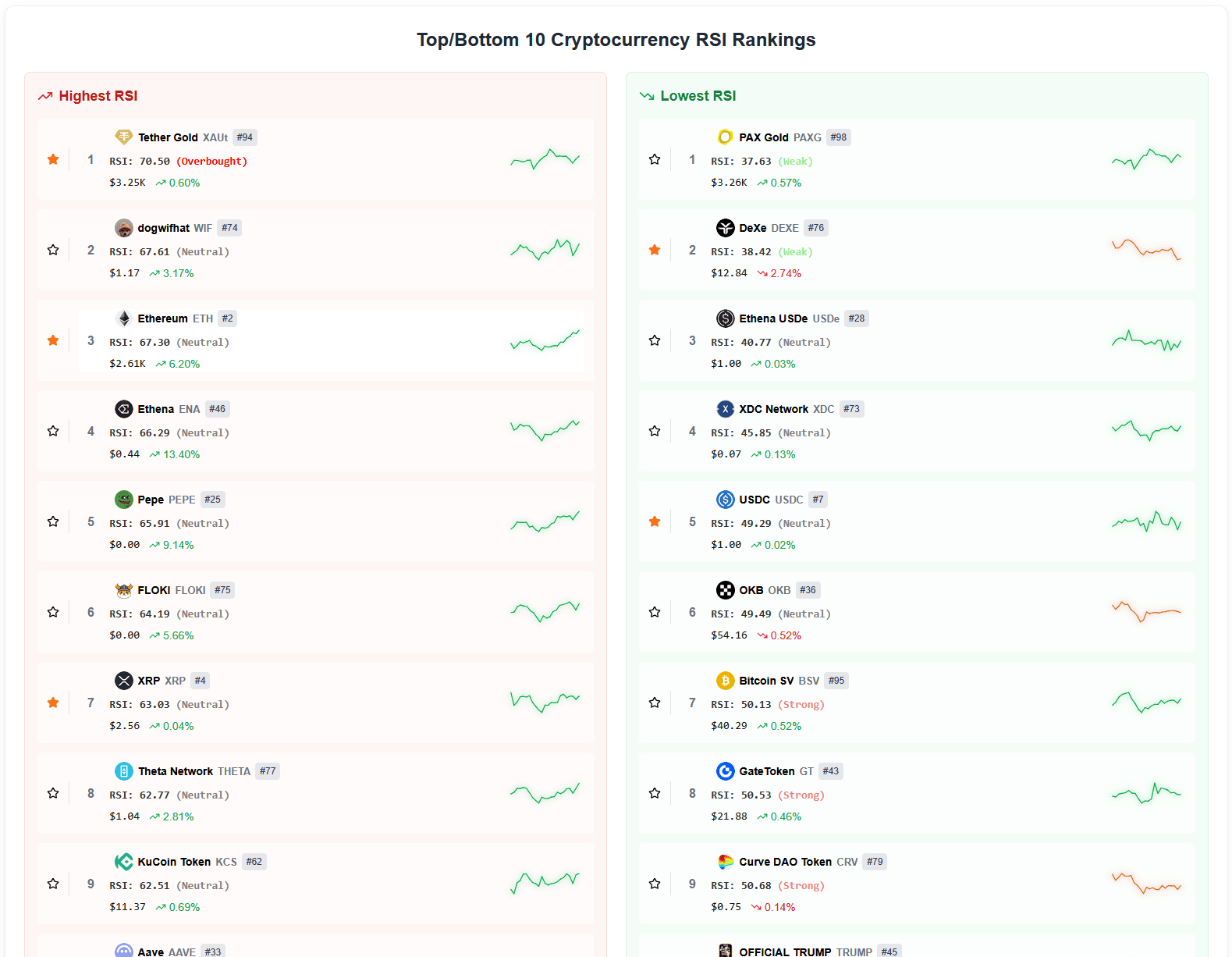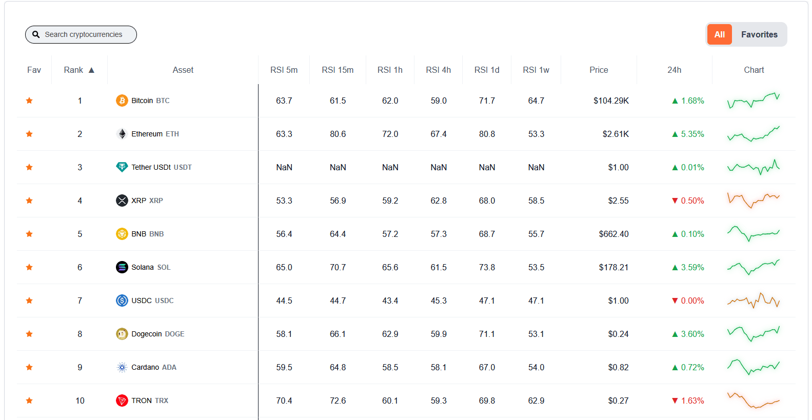 Che tu sia un day trader o un investitore a lungo termine, questo strumento ti offre una chiara panoramica di dove si trova il mercato—ora. Individua le monete che stanno entrando in territorio di ipercomprato (RSI > 70), o cerca quelle in zone di ipervenduto (RSI < 30) che potrebbero presentare opportunità di acquisto.