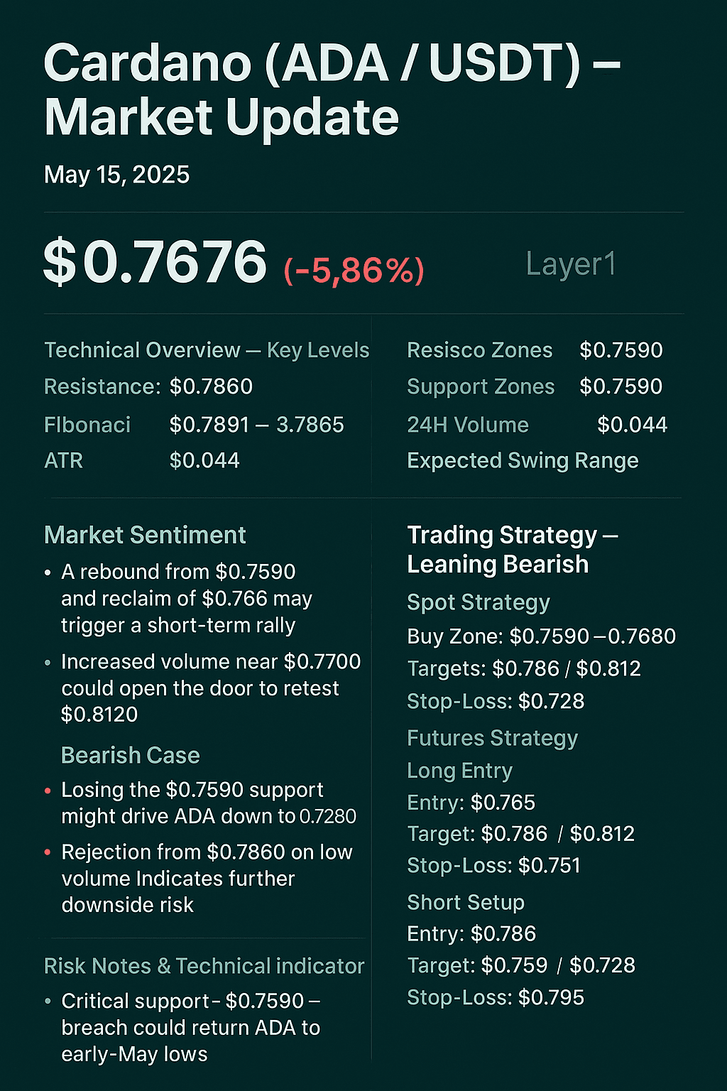 Supporto Critico: $0.7590 – la violazione potrebbe riportare $ADA ai minimi di inizio maggio.