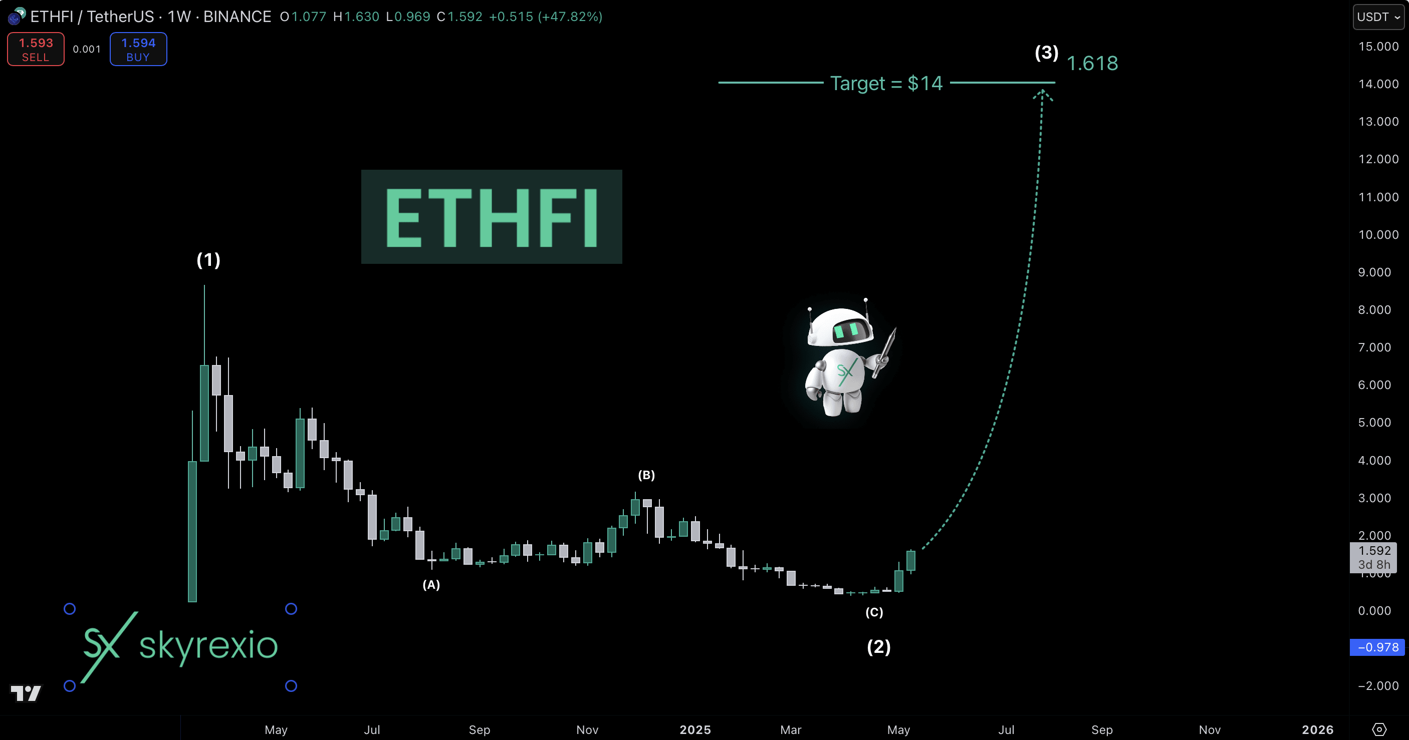 Dopo il pump della quotazione, questa criptovaluta è tornata indietro così tanto nella onda globale 2 a forma di ABC. L'indicatore di inversione rialzista/ribassista [Skyrexio] ha stampato il primo punto verde solo sul fondo, di conseguenza l'asset è entrato in un mercato rialzista. Il prossimo obiettivo è 1.61 Fibonacci a $14. Questa sarà l'onda 3 e questo è tutto!