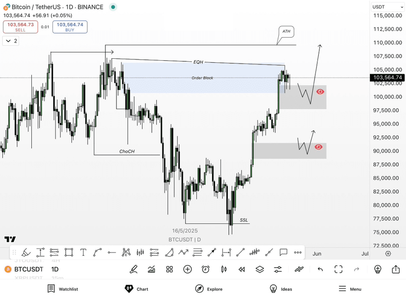 Sguardo sulla zona 102k–100k per una continuazione rialzista.