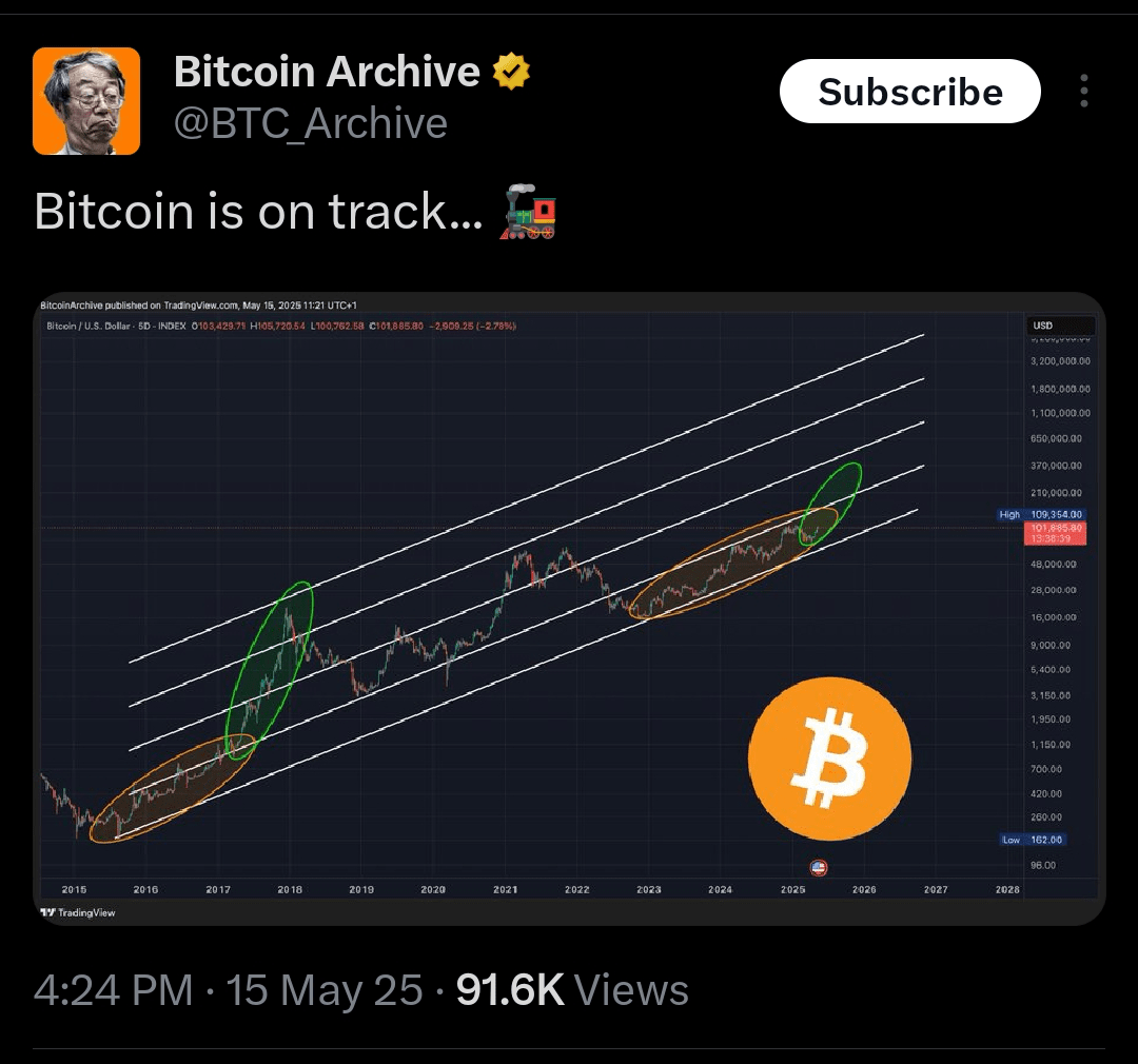 Il 15 maggio 2025, un post di @BTC_Archive su X, che ha ottenuto 91,6K visualizzazioni, ha condiviso un'ottimistica prospettiva per Bitcoin (BTC), affermando: "Bitcoin è sulla buona strada..." Accompagnato da un dettagliato grafico di TradingView, il post suggerisce che Bitcoin è pronto per un significativo movimento verso l'alto. Analizziamo il grafico e le implicazioni per la traiettoria del prezzo di BTC.