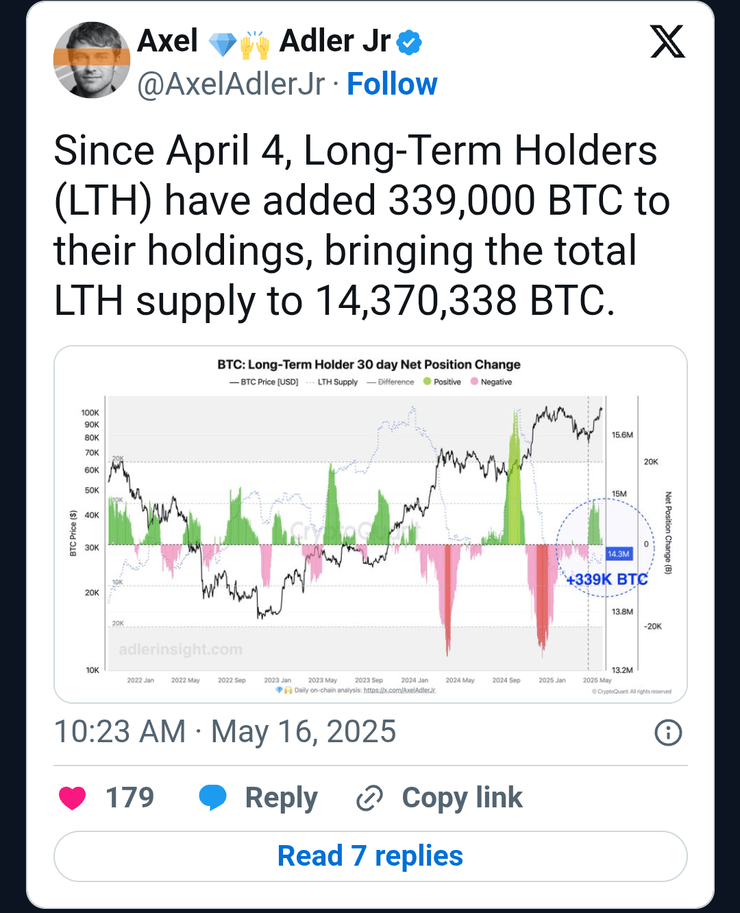 Nel mondo delle criptovalute, il comportamento di detenzione racconta una storia potente. Dal 4 aprile, i titolari di Bitcoin a lungo termine (LTH) hanno significativamente aumentato le loro posizioni, aggiungendo un incredibile 339.000 $BTC ai loro portafogli. Questa forte tendenza all'accumulo ha spinto l'offerta totale di LTH a 14.370.338 BTC, rafforzando la fiducia che questi detentori hanno nel valore a lungo termine di Bitcoin.