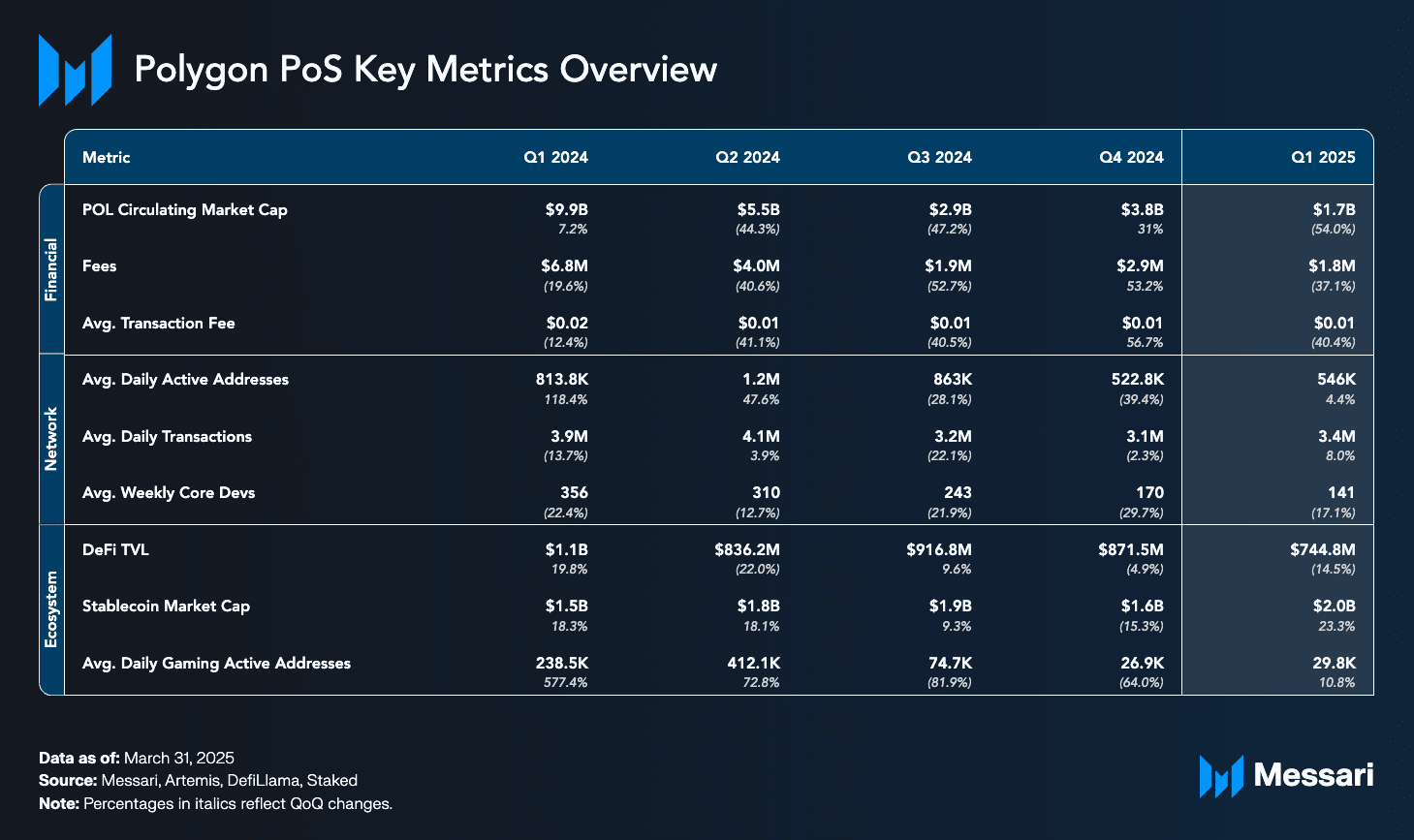 Migrazione del Token POL: Il 92.7% della fornitura di MATIC è migrato a POL; la capitalizzazione di mercato è diminuita del 54% QoQ a $1.7B.
