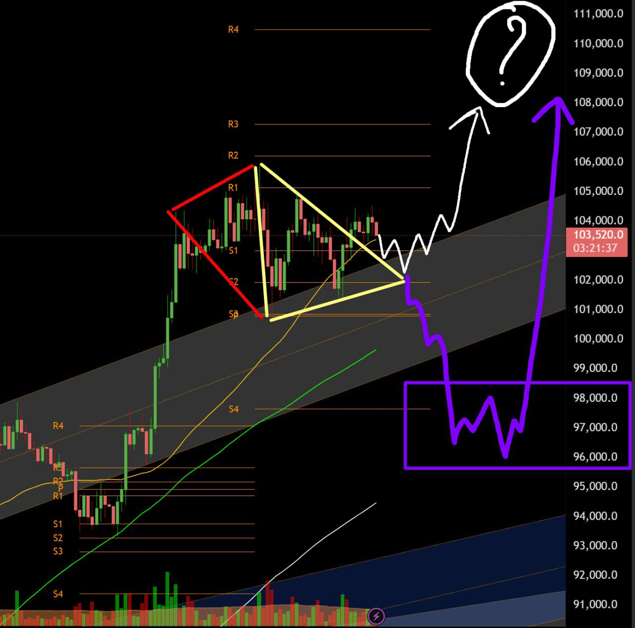 Il secondo percorso verso $107K sarebbe attraverso il pattern del diamante. Ciò significa prima scendere nell'area del blocco viola, e solo dopo spingere verso 107K.