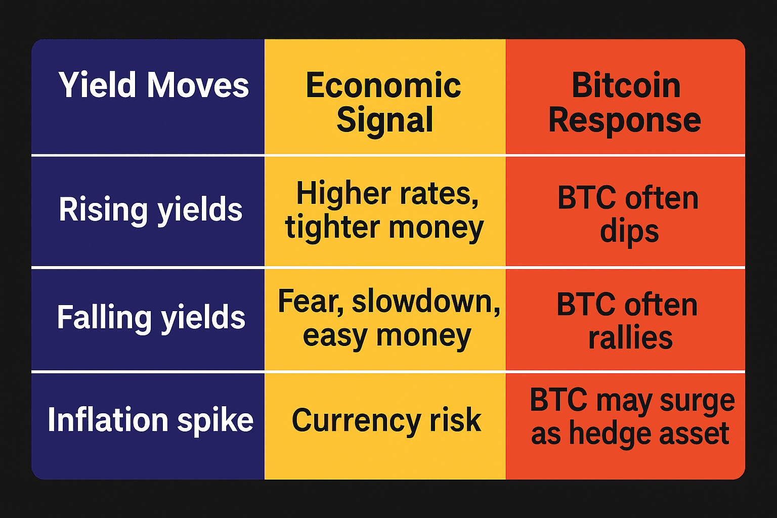 Quando i rendimenti aumentano perché l'economia sta esplodendo, gli investitori tendono a spostarsi da asset più rischiosi come la crypto verso quelli tradizionali. Quando i rendimenti scendono—soprattutto a causa di paura o incertezza—Bitcoin può salire mentre le persone cercano alternative alla moneta fiat.