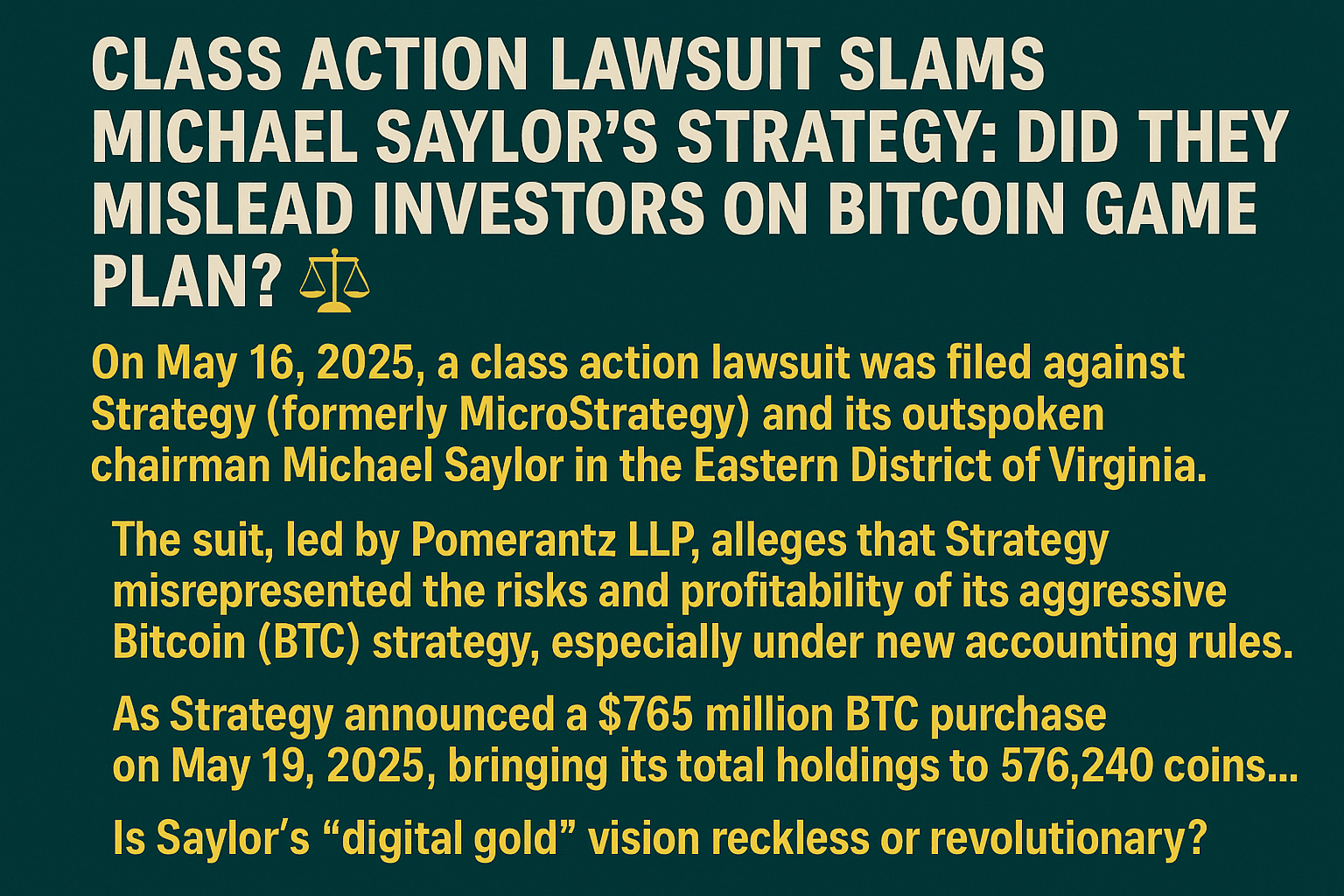 Il 16 maggio 2025, è caduta una bomba nel mondo delle criptovalute: è stata intentata una causa collettiva contro la Strategia (ex MicroStrategy) e il suo presidente esplicito, Michael Saylor, nel Distretto Orientale della Virginia. La causa, guidata da Pomerantz LLP, accusa l'azienda e i dirigenti chiave di aver fuorviato gli investitori sui rischi e sulla redditività della loro aggressiva strategia Bitcoin (BTC), in particolare alla luce delle nuove normative contabili. Mentre la Strategia annunciava un acquisto di BTC da 765 milioni di dollari il 19 maggio 2025, portando le sue partecipazioni totali a 576.240 monete, la tempesta legale ha acceso un acceso dibattito. La visione "oro digitale" di Saylor è imprudente o rivoluzionaria? Ecco tutti i dettagli su questo dramma cripto ad alto rischio, riportato il 19 maggio 2025.