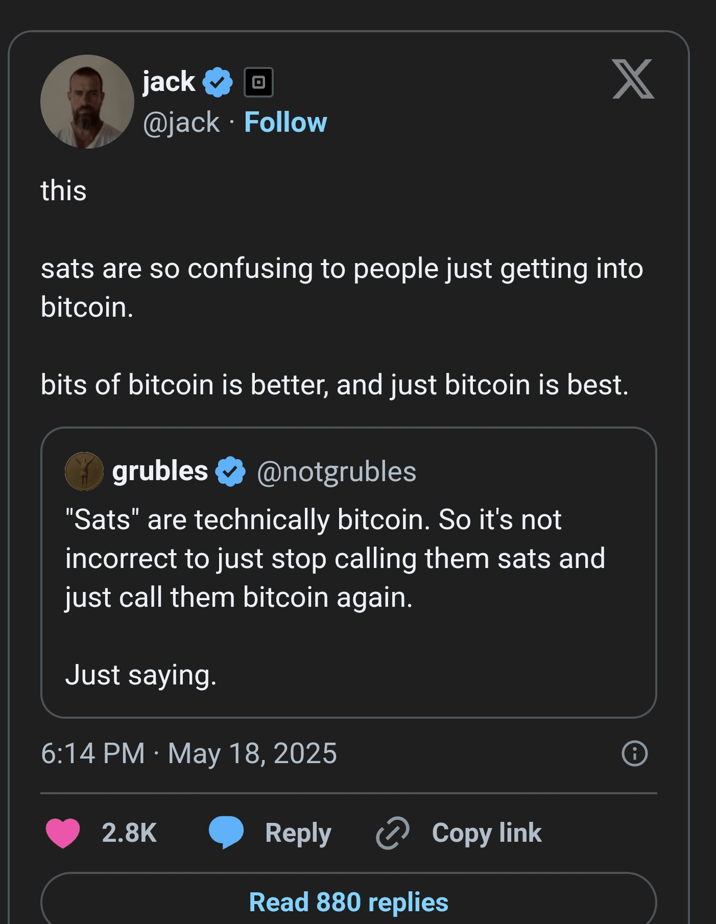 Il CEO di Block Inc. Jack Dorsey ha suscitato un acceso dibattito nella comunità crittografica sostenendo l'idea di abbandonare il termine "satoshi" a favore del nome dell'unità minima semplicemente "bitcoin". Lo ha dichiarato il 18 maggio 2025 sui social media X, commentando un post di un utente