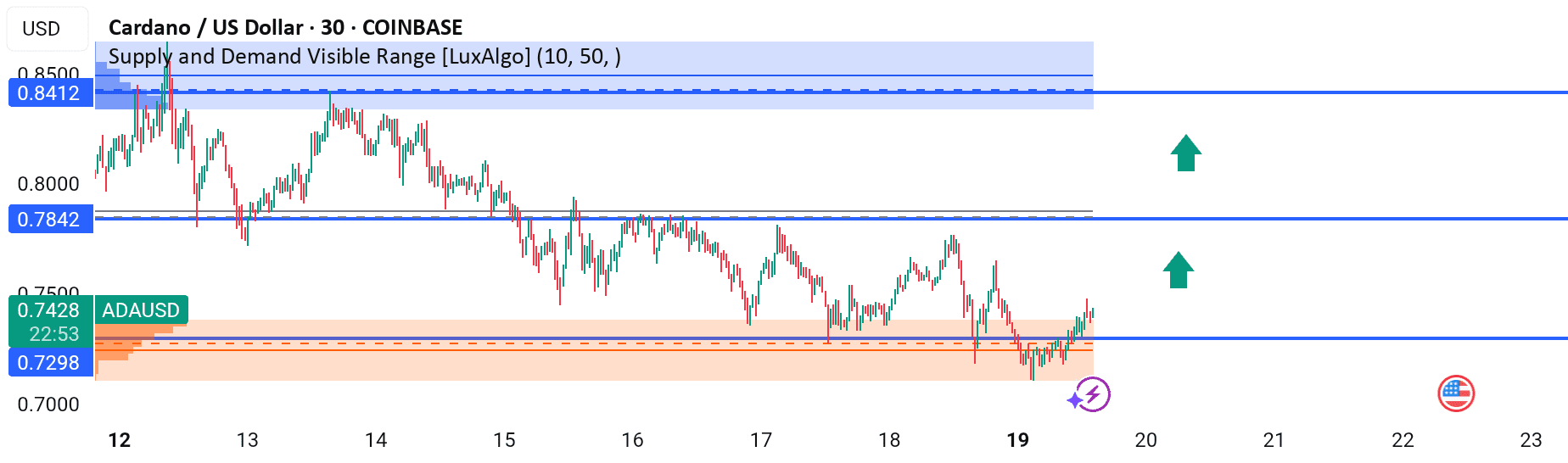 Due importanti livelli di resistenza si trovano davanti a $0.7842 e $0.8412 – entrambe precedentemente testate come zone di offerta. Se ADA riesce a mantenere il suo attuale momentum rialzista e a superare $0.75 con volume, potremmo vedere un rally a breve termine verso queste zone chiave.