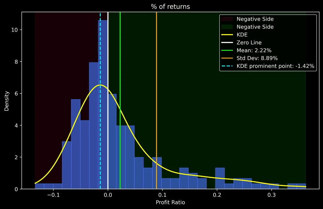 Utilizzando KDE, la modalità dei rendimenti è leggermente inferiore allo 0%, il che significa che la distribuzione principale è lievemente negativa.