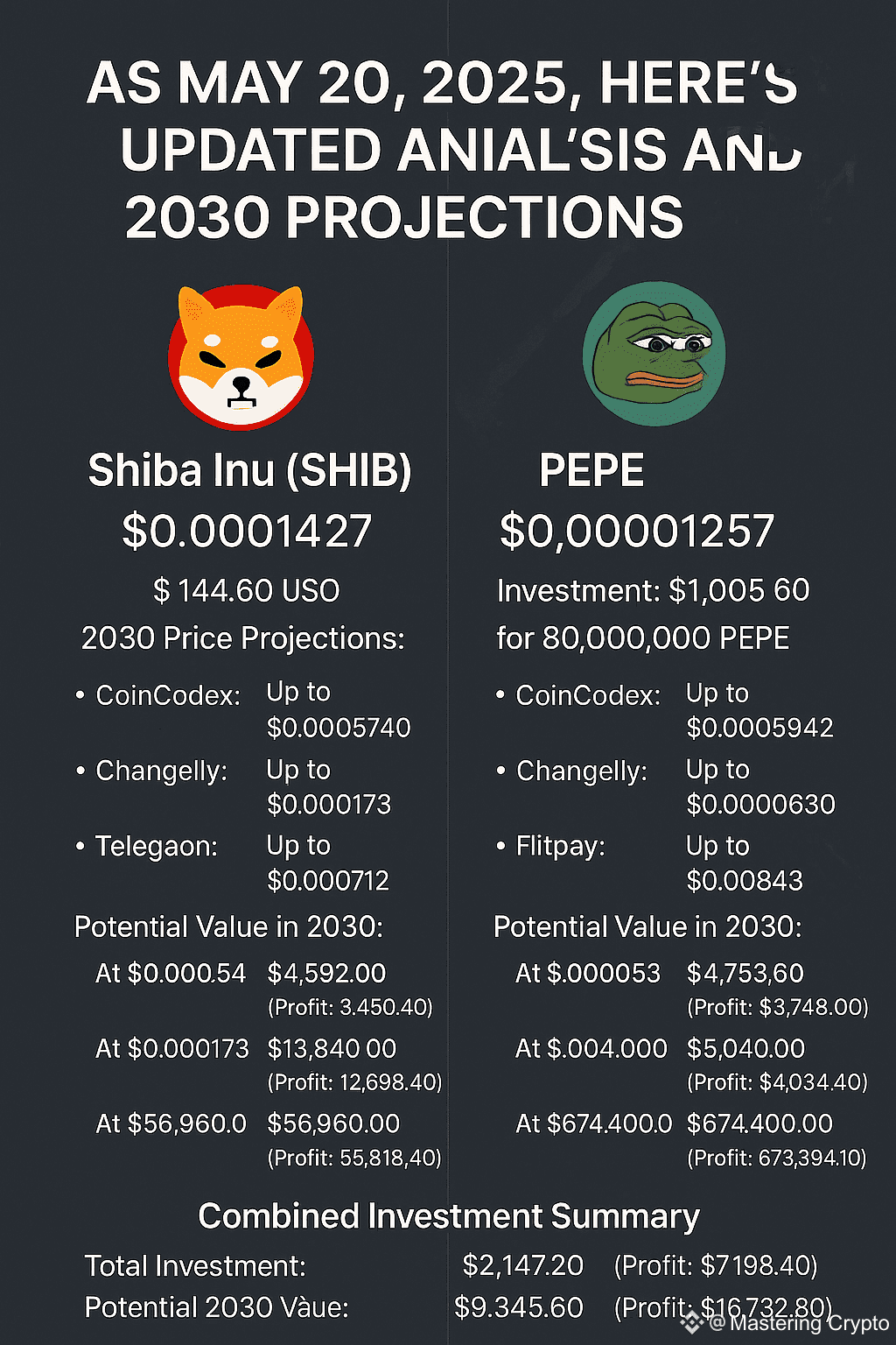 A partire dal 20 maggio 2025, ecco un'analisi aggiornata dell'acquisto di 80 milioni di token Shiba Inu (#SHİB ) e 80 milioni di token #PEPE , basata sui prezzi attuali e sulle proiezioni per il 2030.