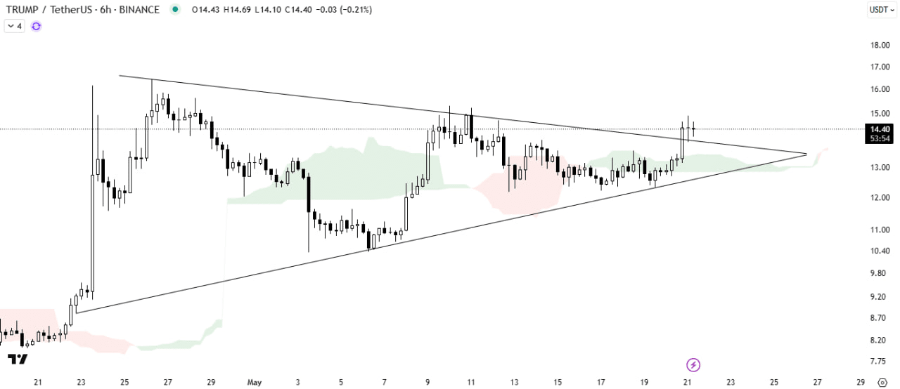 TRUMP è uscito dal modello triangolo simmetrico con volume significativo e attualmente sta testando nuovamente il livello di breakout. La nuvola Ichimoku indica un momento rialzista, supportando il bias rialzista.