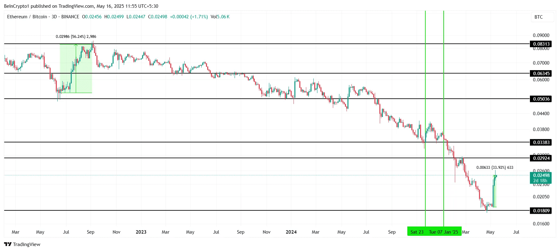 La coppia ETH/BTC ha registrato la sua prima rottura da dicembre 2024. Per la prima volta in cinque mesi, la coppia ha mostrato un minimo più alto, il che è generalmente considerato un segnale di tendenza rialzista. Questa rottura è significativa, segnando un aumento del 34% in solo una settimana.