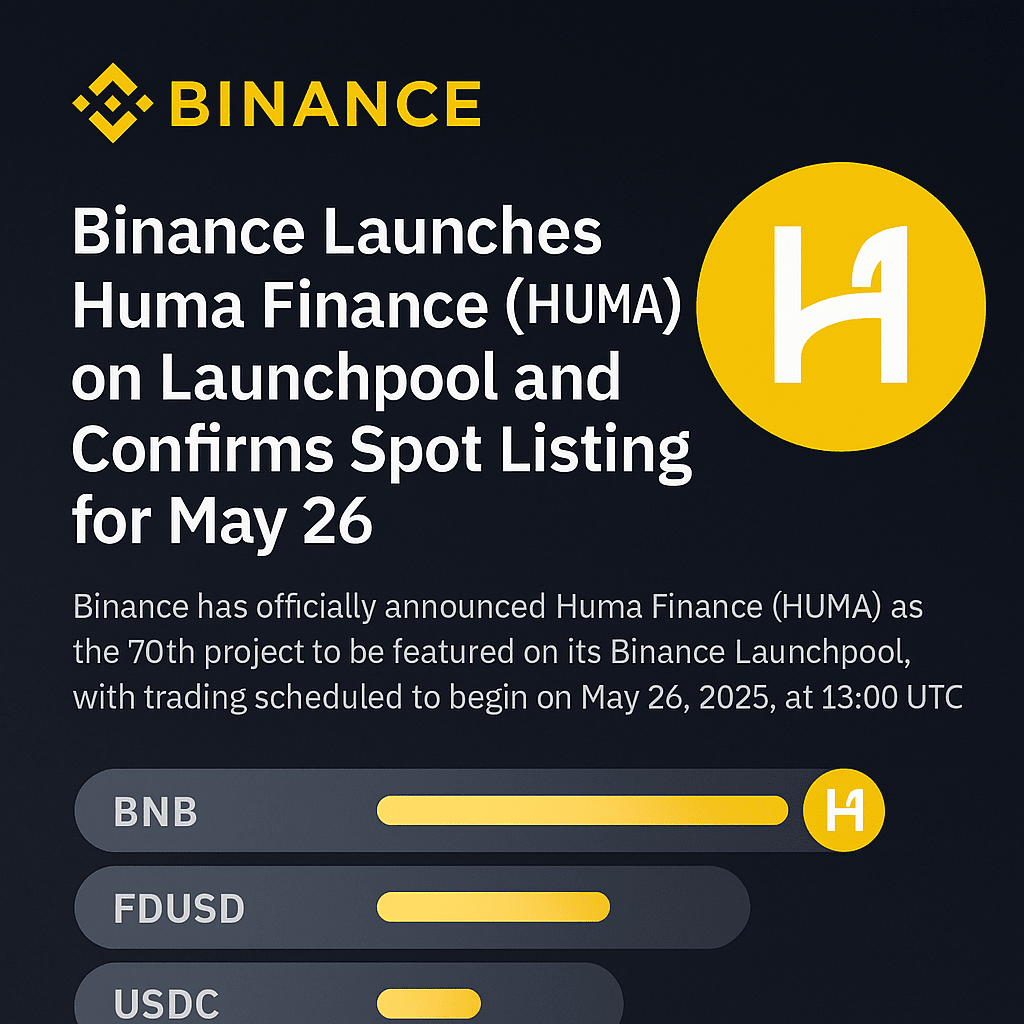 Binance ha annunciato Huma Finance (HUMA) come il 70° progetto su Binance Launchpool, con l'inizio del trading spot fissato per il 26 maggio 2025, alle 13:00 UTC. Gli utenti possono coltivare token HUMA stakando BNB, FDUSD, o USDC durante un periodo di farming di 3 giorni che inizia il 23 maggio 2025.