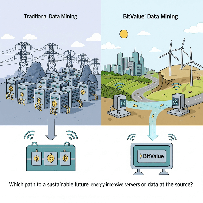 L'estrazione verde consiste nel generare valore a partire da dati reali, utili e verificati, senza la necessità di spendere risorse fisiche. Invece di competere per risolvere calcoli crittografici come nel Bitcoin, gli utenti di BitValue semplicemente condividono informazioni preziose generate dai propri dispositivi: veicoli, sensori ambientali, coltivazioni, droni o telefoni. Queste informazioni diventano beni digitali utili per industrie, governi, assicuratori, ricercatori e altro ancora.