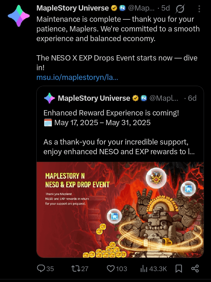 I giocatori possono anche partecipare a eventi comunitari su Discord e Galxe, guadagnando NXPC attraverso missioni e competizioni. Con il 47–54% di retention dei giocatori dai playtest e 286,5K follower su X, la comunità di Mapler è vibrante e in crescita. I post di X da parte di utenti e KOL di gaming lodano la nuova interfaccia utente e condividono suggerimenti sul gameplay, riflettendo un forte sentimento.