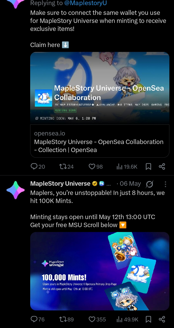 Il lancio è stato un traguardo, contrassegnato dal minting SBT di MSU Scroll (6–12 maggio 2025), il più grande mint di NFT di Avalanche con oltre 1,7 milioni di asset mintati. Questo evento ha fatto impennare gli indirizzi attivi di Avalanche del 549%, mostrando l'appeal di MapleStory nel Web3. Sebbene il mint sia terminato, i giocatori possono ancora scambiare questi NFT su OpenSea, sbloccando oggetti esclusivi in-game come il Coin Mount e l'Opening Party Set.