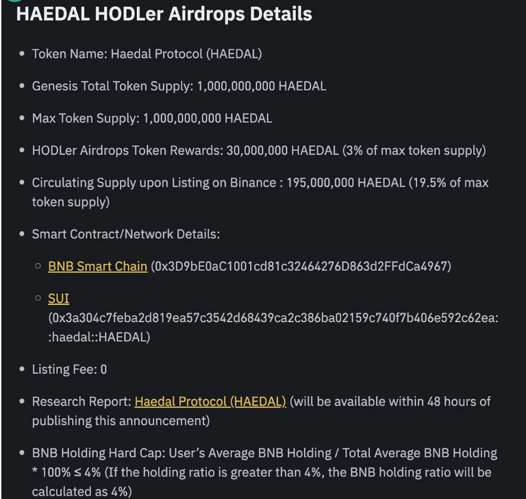 😀 Haedal Protocol ($HAEDAL) – protocollo di liquid staking sulla blockchain di Sui, ufficialmente diventato il 19° progetto a partecipare al programma HODLer Airdrops su Binance!