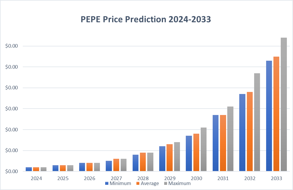 Si prevede che il prezzo di Pepe raggiungerà il livello più basso nel 2033 a $ 0,000053. I prezzi del pepe possono arrivare fino a $ 0,000064, con un prezzo medio nel 2033 pari a $ 0,000055.