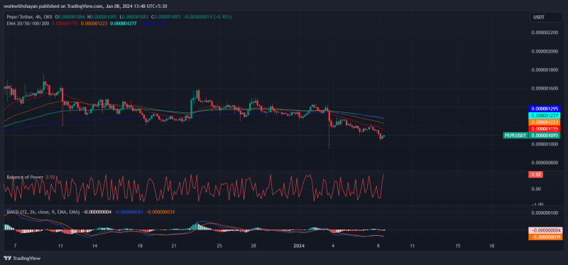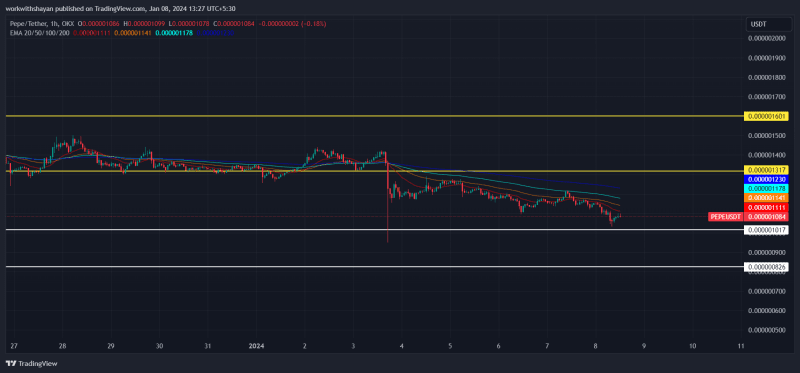 L'analisi dei prezzi PEPE dell'8 gennaio conferma la pressione di vendita sugli orsi poiché il prezzo PEPE è sceso dalla resistenza di 0,0000013 $. Attualmente, il prezzo del PEPE si aggira in una zona di supporto chiave e sta vivendo un sentimento ribassista.