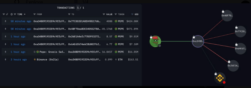 Dopo un breve periodo di aggiustamento e stabilizzazione dei prezzi, il valore di Pepe ha iniziato a salire in modo significativo il 30 aprile, impennandosi del 214% in soli due giorni per raggiungere un livello record. Binance ha attribuito l’impennata agli acquisti massicci da parte dei principali investitori.