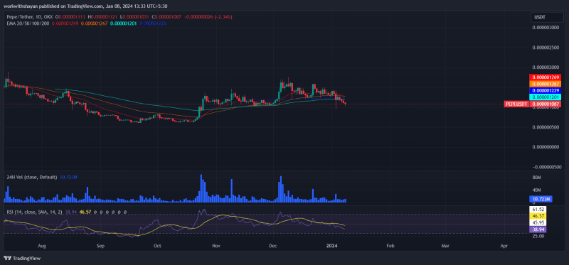 Analizzando il grafico dei prezzi giornalieri di Pepe Coin, il prezzo di Pepe ha registrato una lieve domanda di vendita poiché il prezzo è stato rifiutato da un picco di $ 0,0000013. Attualmente, i prezzi del PEPE stanno sollevando preoccupazioni ribassiste poiché il prezzo viene scambiato vicino alle principali linee di supporto ed è sull’orlo di un forte crollo. Il volume degli scambi 24 ore su 24 è salito a 10,72 milioni di dollari, indicando un crescente interesse per l'attività di trading odierna. Pepe è scambiato a 0,000001085$, in calo di oltre l'8,4% nelle ultime 24 ore.