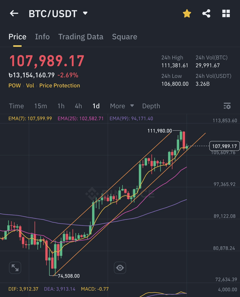 Il grafico $BTC /USDT mostra un prezzo di circa 108.000 USDT, vicino alla resistenza a 114.853,60, in calo del 2,6%. Le EMAs (10, 25, 99) tendono al rialzo, ma il MACD segnala un momento ribassista. Il supporto si trova a circa 97.000, con resistenza a 118.000,00 se dovesse superare. Un ritracciamento a 100.000–102.000 è probabile, ma un'impennata di volume potrebbe spingerlo più in alto.