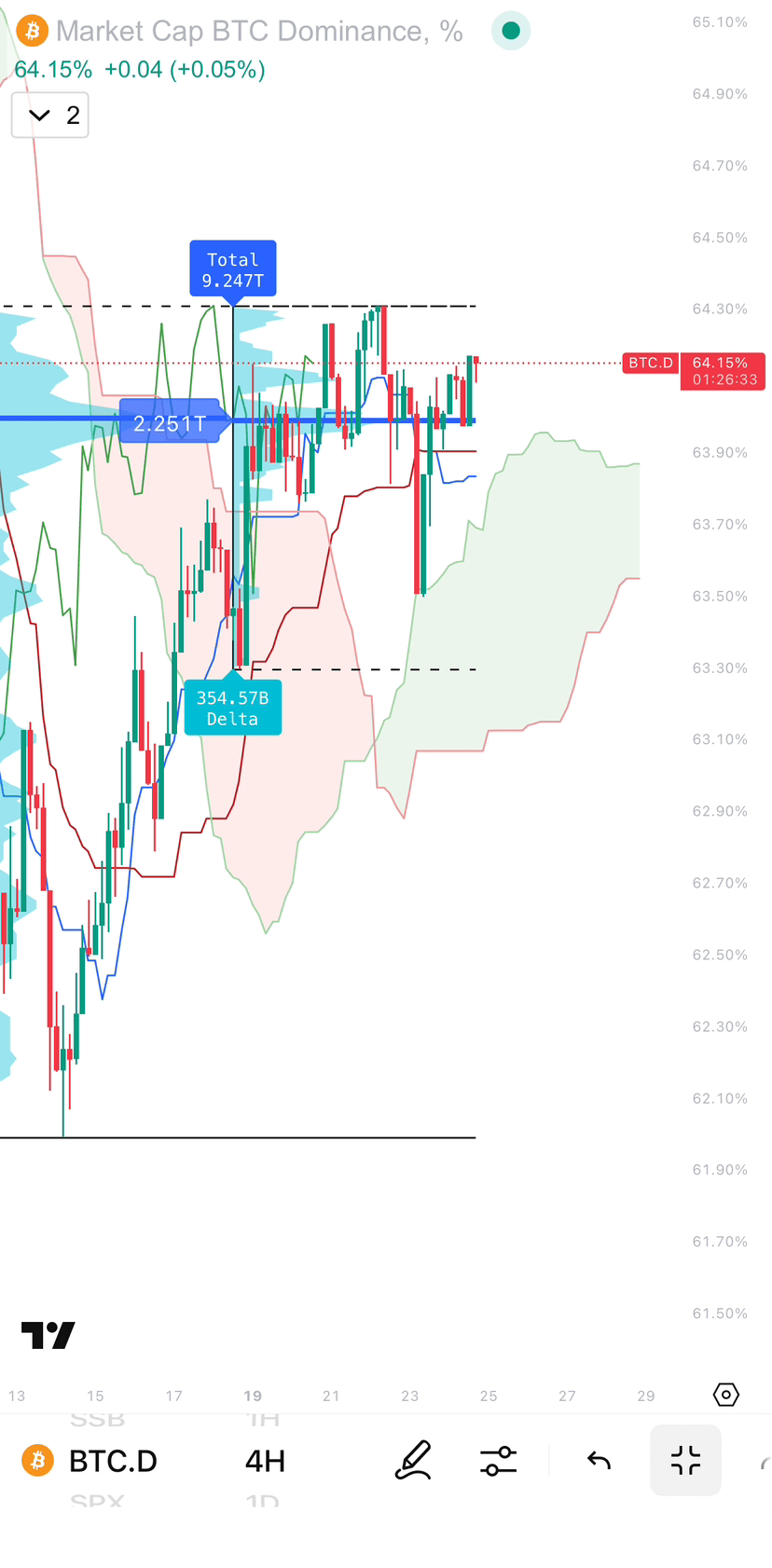 Il grafico mostra che BTC.D ha attraversato una fase di volatilità nelle ultime 4 ore (4H), con livelli di supporto e resistenza importanti contrassegnati. Il livello di resistenza più vicino si trova intorno al 65.10%, mentre il livello di supporto importante può essere identificato tra il 63.10% e il 63.50%. Le recenti fluttuazioni, in particolare nel momento 01:26:33, indicano che una pressione di vendita a breve termine è emersa, spingendo l'indice al di sotto della media.
