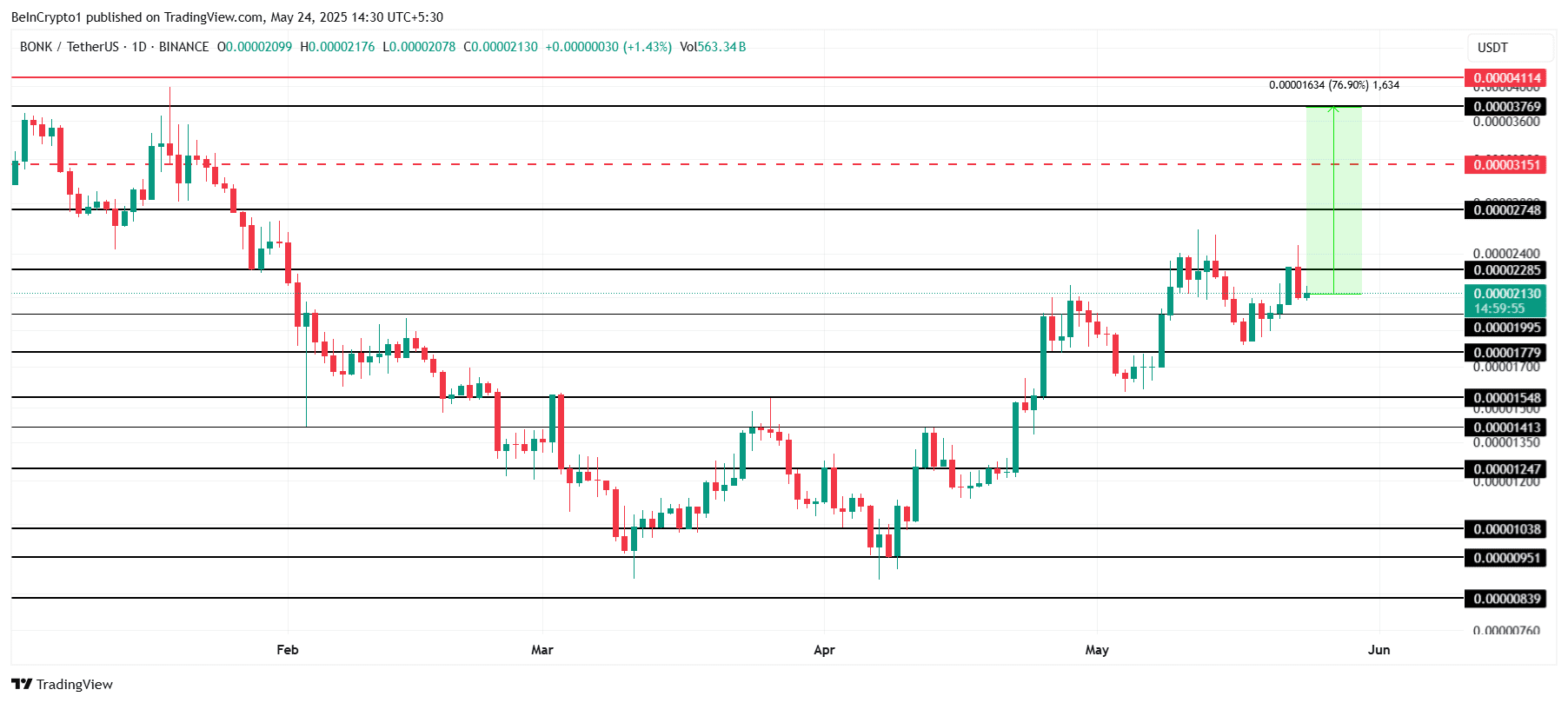 Attualmente, BONK scambia a $0.00002130 e affronta una resistenza a $0.00002285. Per recuperare completamente le perdite registrate dall'inizio del 2025, BONK deve salire di circa il 77%, raggiungendo $0.00003769.