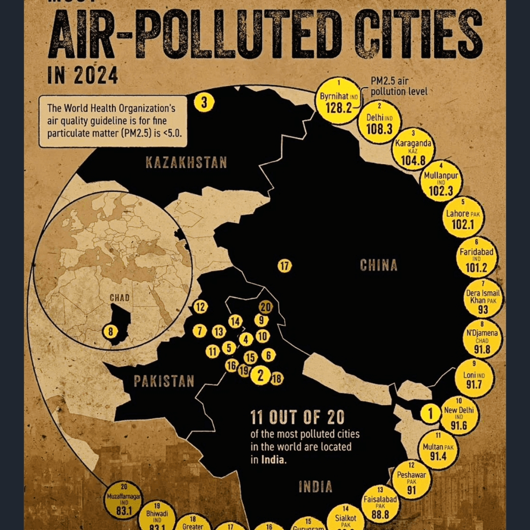 11 delle 20 città più inquinate del mondo si trovano in India, guidate da Byrnihat con un incredibile 128,2 µg/m³ PM2.5—oltre 25 volte il limite di sicurezza dell'OMS. Delhi, Faridabad e Ghaziabad non sono lontani, soffocando sotto una crescita incontrollata e una governance fallimentare.