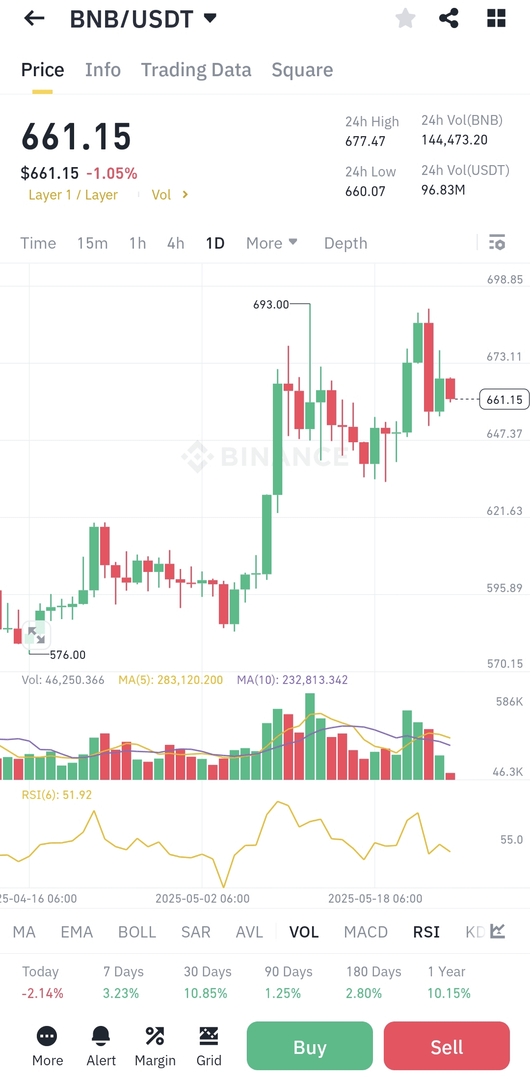 A partire dal 25 maggio 2025, Binance Coin (BNB) viene scambiato a circa $661,20.