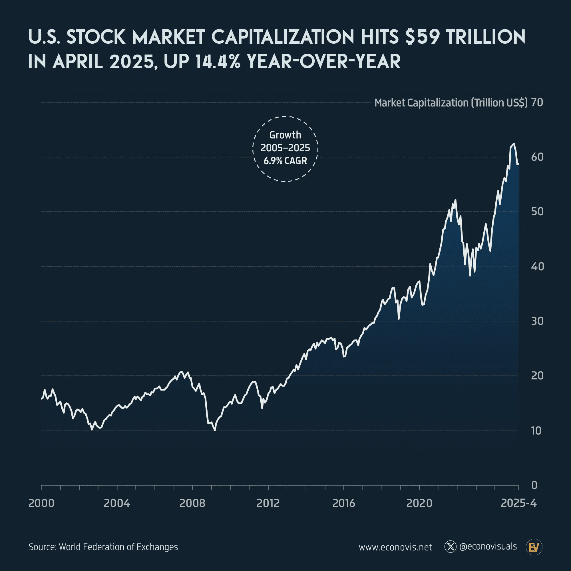 Mercato azionario degli Stati Uniti: La capitalizzazione di mercato totale ha raggiunto 59 trilioni di dollari nell'aprile 2025, segnando un aumento del 14,4% rispetto all'anno precedente. Voronoi App