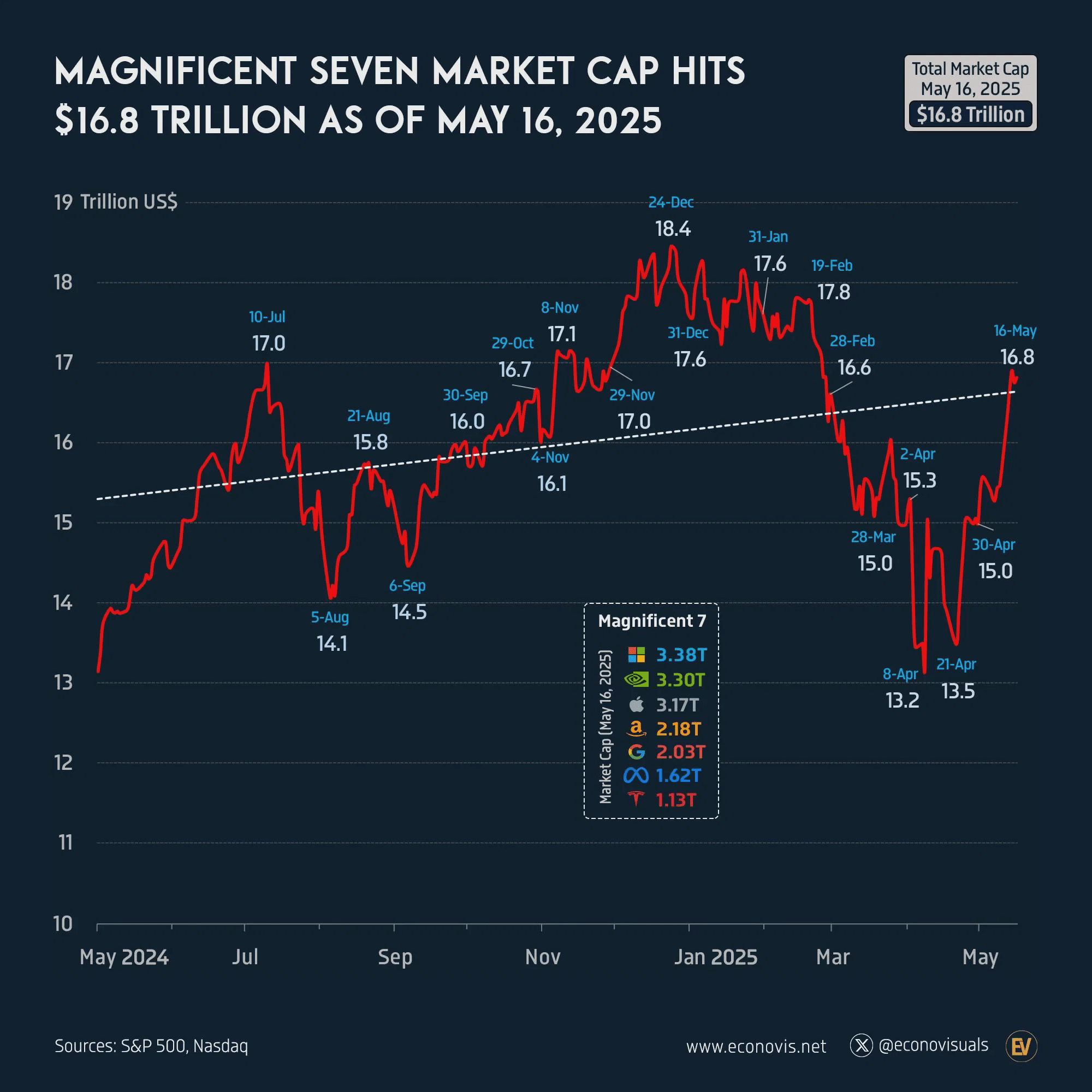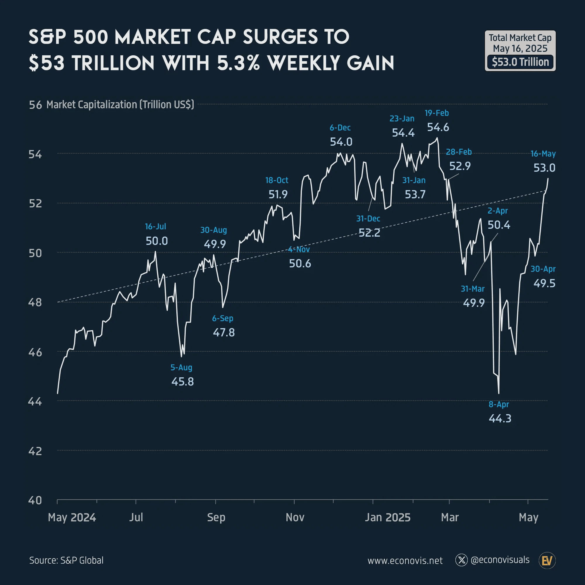 Indice S&P 500: A partire dal 21 maggio 2025, la capitalizzazione di mercato totale dell'S&P 500 ammontava a 52,0 trilioni di dollari. Voronoi App