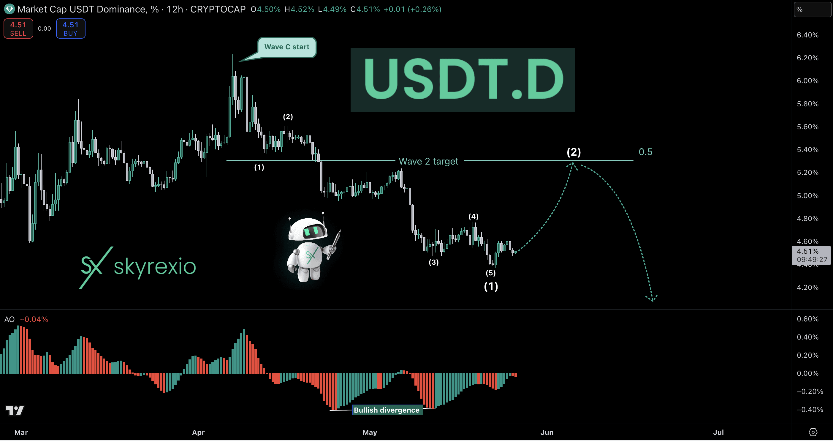 Il timeframe di 12 ore dell'Awesome Oscillator mostra che l'onda 1 del C globale è stata completata. Ora è tempo dell'onda reattiva 2. L'obiettivo più probabile è il 5,3% a 0,5 di Fibonacci. Solo da lì mi aspetto la continuazione del bull run delle criptovalute (per $BTC ) e l'inizio (per gli altcoin).