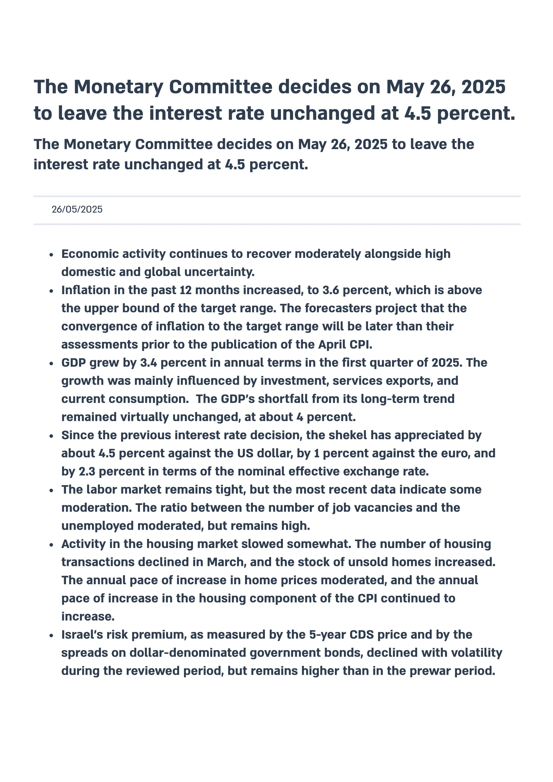 Comunicato stampa ufficiale: Il Comitato Monetario decide il 26 maggio 2025 di mantenere il tasso d'interesse invariato al 4.5 percento.