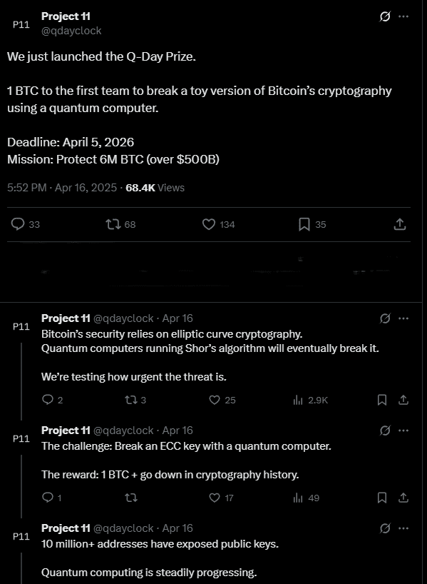 Nel frattempo, il Progetto 11, un gruppo di ricerca quantistica, ha offerto una ricompensa di $85.000 a chiunque possa decifrare una versione semplificata della crittografia di Bitcoin utilizzando un computer quantistico. Mentre il test mira a lunghezze di chiave brevi (da 1 a 25 bit), ben al di sotto dello standard di 256 bit di Bitcoin, aiuta a valutare quanto sia urgente la minaccia quantistica.