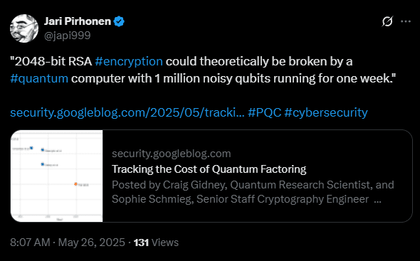 Craig Gidney, un ricercatore quantistico di Google, ha dichiarato che fattorizzare una chiave RSA a 2048 bit â uno dei principali standard crittografici â potrebbe non richiedere piĂš 20 milioni di qubit, come stimato nel 2019. Invece, potrebbe ora essere realizzato con meno di un milione di qubit in meno di una settimana.