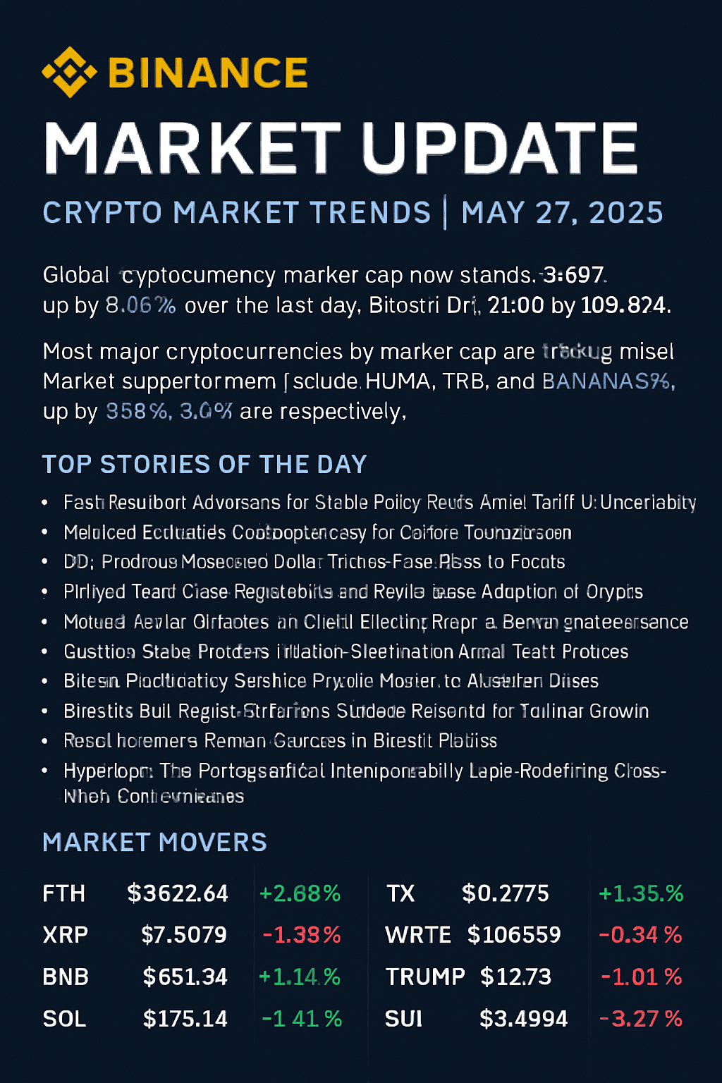Aggiornamento di Mercato Binance | 27 maggio 2025: Bitcoin si stabilizza, gli Altcoin salgono, il mercato osserva le tendenze della regolamentazione e dell'inflazione.