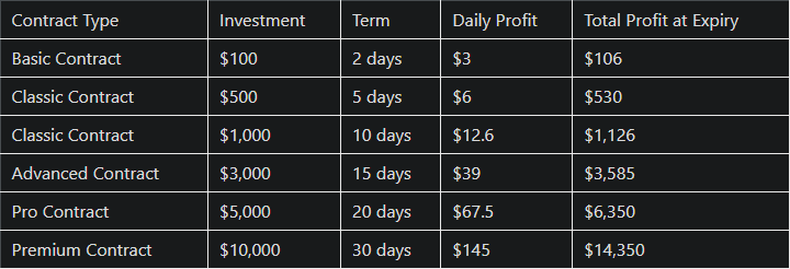 Dopo l'acquisto di un contratto, i proventi verranno accreditati automaticamente sul tuo conto il giorno successivo. Quando il saldo del conto raggiunge $100, puoi scegliere di prelevare nel tuo portafoglio di valuta digitale o continuare ad acquistare contratti per ottenere più reddito.