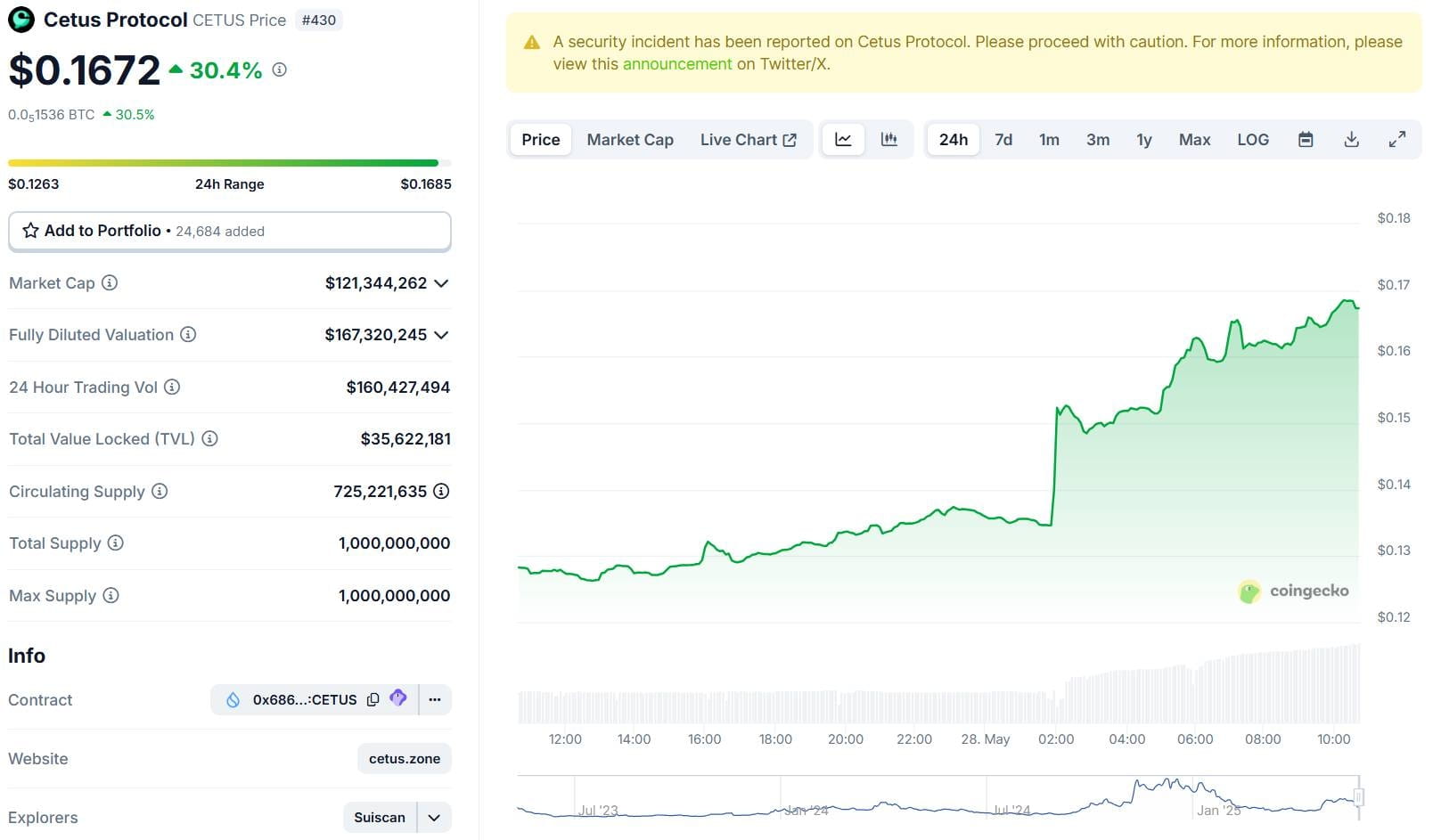 Fluttuazione del prezzo di CETUS nelle ultime 24 ore, screenshot di CoinGecko alle 10:40 del 28/05/2025