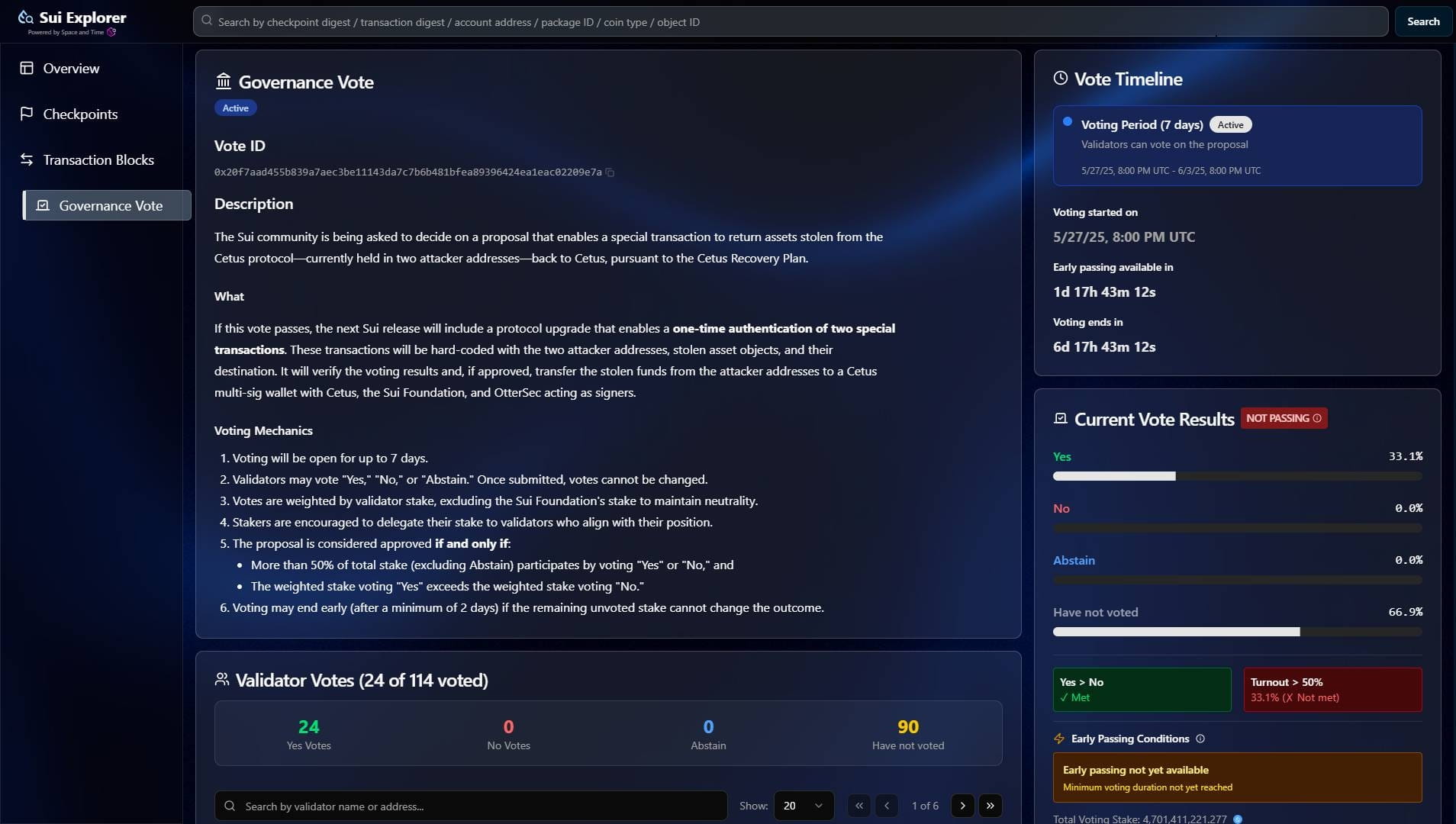 Fino al momento della scrittura, su un totale di 114 validator nel network Sui, 23 entità hanno votato con una percentuale di approvazione della proposta che raggiunge il 100%. La proposta sarà approvata solo se oltre il 50% del totale degli SUI in staking partecipa al voto (escludendo le schede bianche) e la percentuale di voti a favore supera quella dei voti contrari.