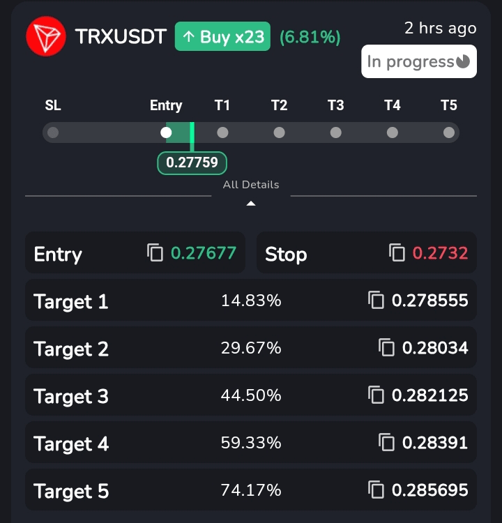 Oggi ho condiviso un forte e calcolato segnale di acquisto per TRXUSDT, preparato tenendo conto delle condizioni di mercato e dell'azione dei prezzi. Il prezzo di ingresso è stato fissato a 0.27677 – basato su un buon livello di supporto tecnico, mentre lo stop-loss è stato impostato a 0.2732 per mantenere il rischio al minimo.