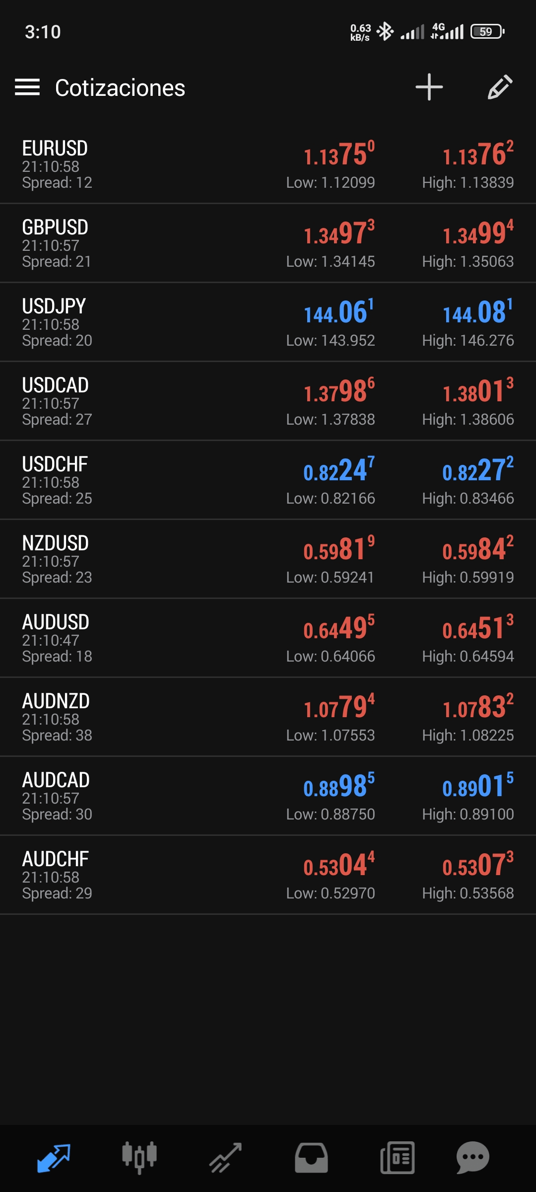 Stai visualizzando la prima finestra di MetaTrader 4 con diverse quotazioni nel mercato Forex, incluse coppie di valute come EUR/USD, GBP/USD, USD/JPY, USD/CHF, tra le altre. In ogni quotazione appaiono elementi chiave: