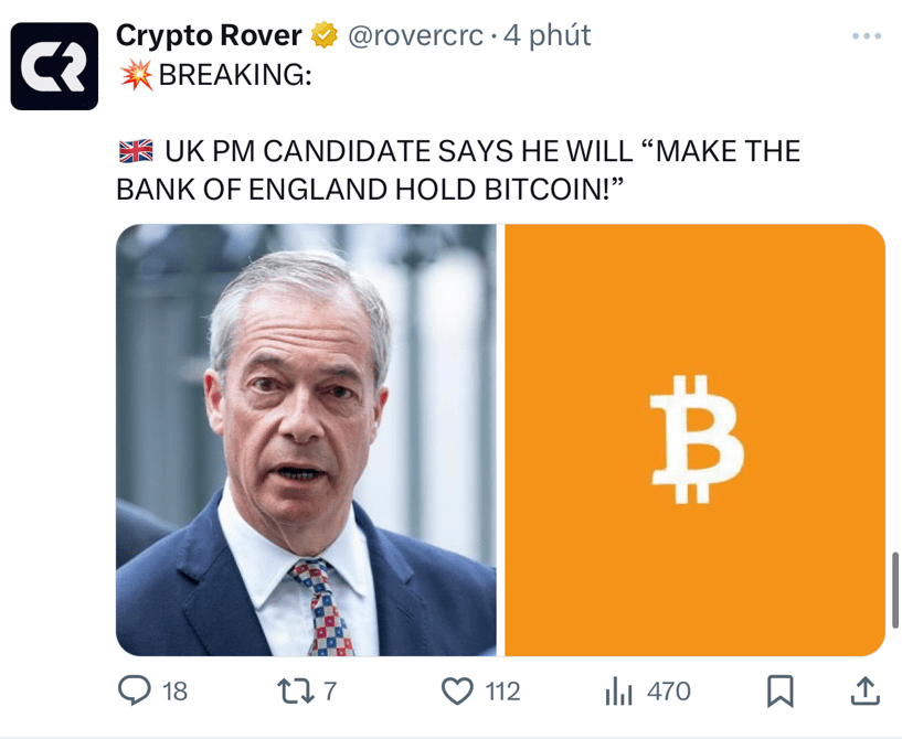 Una dichiarazione scioccante è stata fatta dal candidato Primo Ministro britannico: se eletto, chiederà alla Banca d'Inghilterra (BoE) – una delle banche centrali più conservative al mondo – di aggiungere Bitcoin alle riserve nazionali.