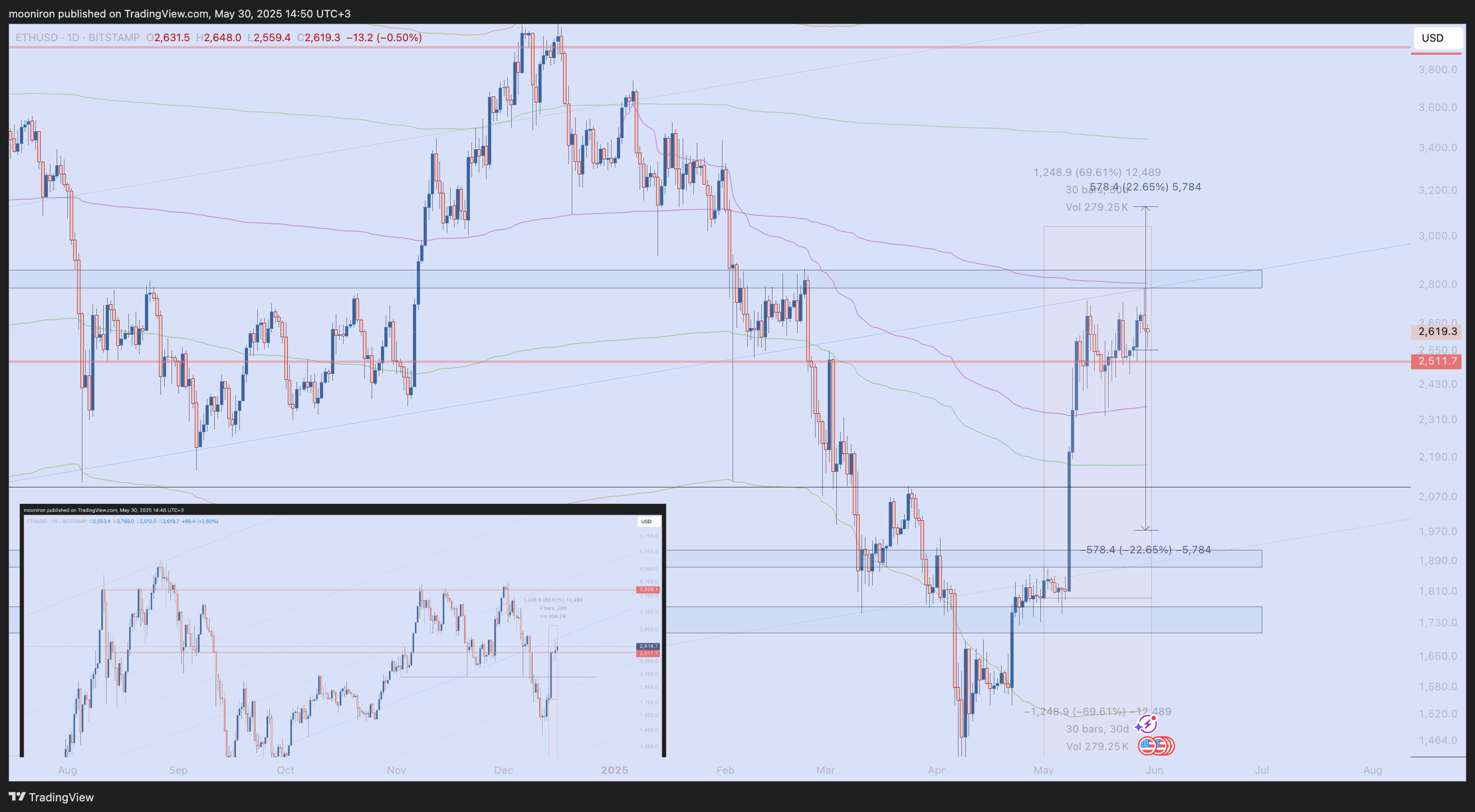 L'immagine mensile è piuttosto rialzista, sembra avere un'immagine settimanale che è soggetta a un po' di correzione. I punti importanti sui miei grafici sono stati fissati per mesi. Uno di essi è la linea rossa 2500 e la scatola blu nell'area 2800-2900. Come ho già detto, non è giusto sognare troppo prima che queste aree siano completamente rotte. Non abbiamo ancora visto una buona chiusura settimanale sopra 2500. Per questo motivo, inizierò a posizionarmi verso l'alto nella correzione che arriverà con il nuovo mese. Le aree 2480-2300-2100 saranno i miei punti di acquisto per le posizioni rialziste. Questo è il mio piano generale.