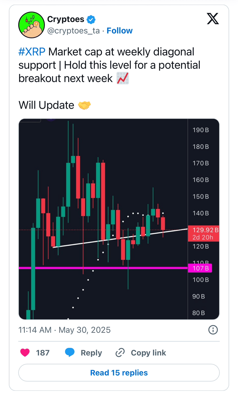 Nell'ultimo aggiornamento di mercato, l'analista di criptovalute famoso Cryptoes ha attirato l'attenzione su un momento cruciale per XRP – quando la capitalizzazione di mercato della criptovaluta sta testando un livello di supporto incrociato importante sul timeframe settimanale. Secondo la sua valutazione sulla piattaforma X, mantenere questo livello potrebbe essere la chiave per un forte breakout già la prossima settimana – un'evoluzione che sia i trader che gli investitori a lungo termine stanno osservando da vicino.