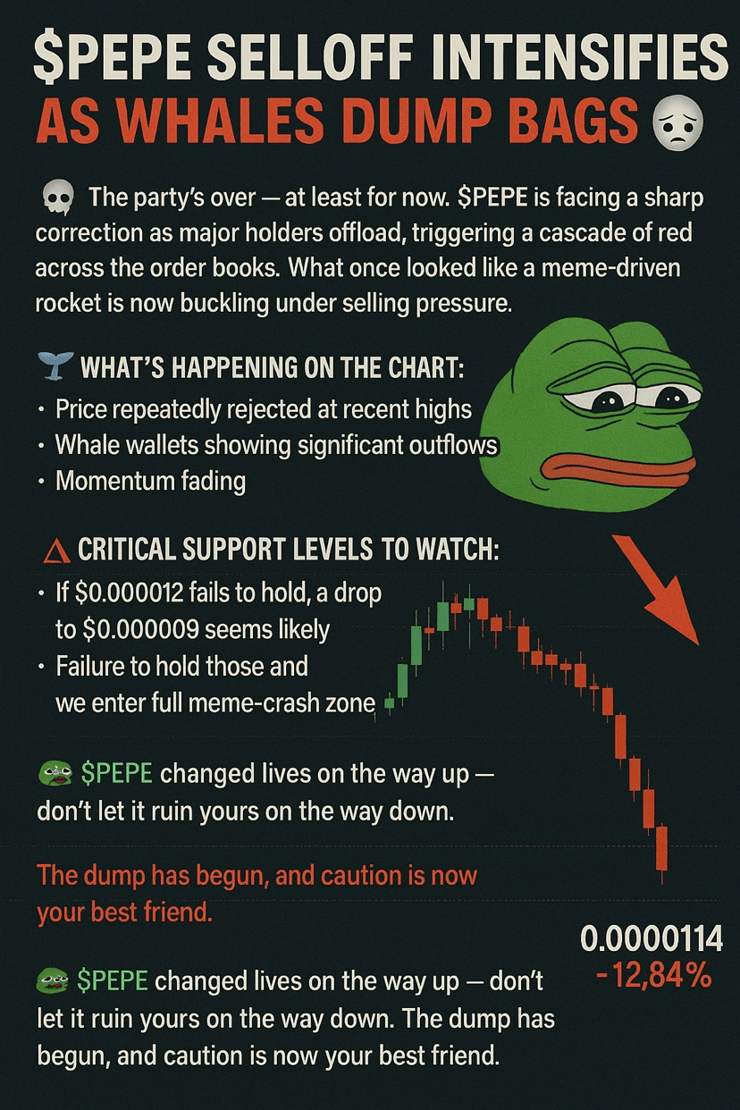 đ La festa è finita â almeno per ora. $PEPE sta affrontando una correzione brusca mentre i principali detentori scaricano, innescando una cascata di rosso nei libri degli ordini. Ciò che una volta sembrava un razzo guidato dai meme ora sta cedendo sotto la pressione delle vendite.